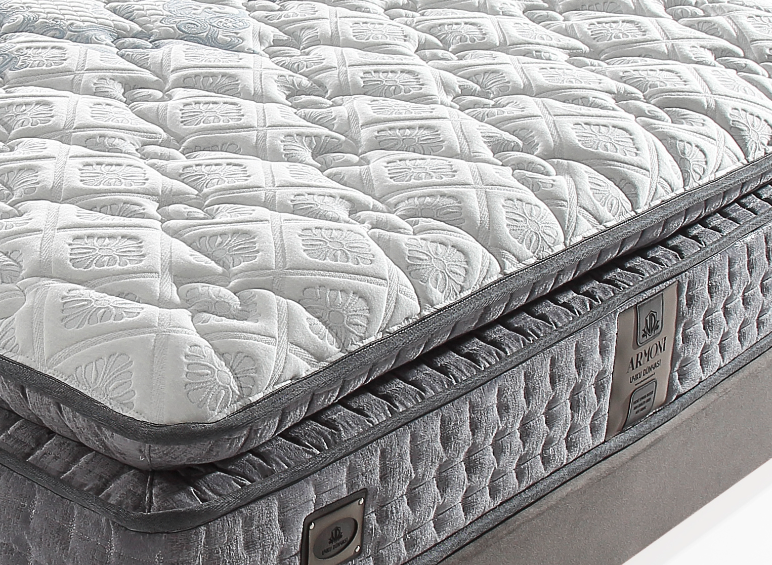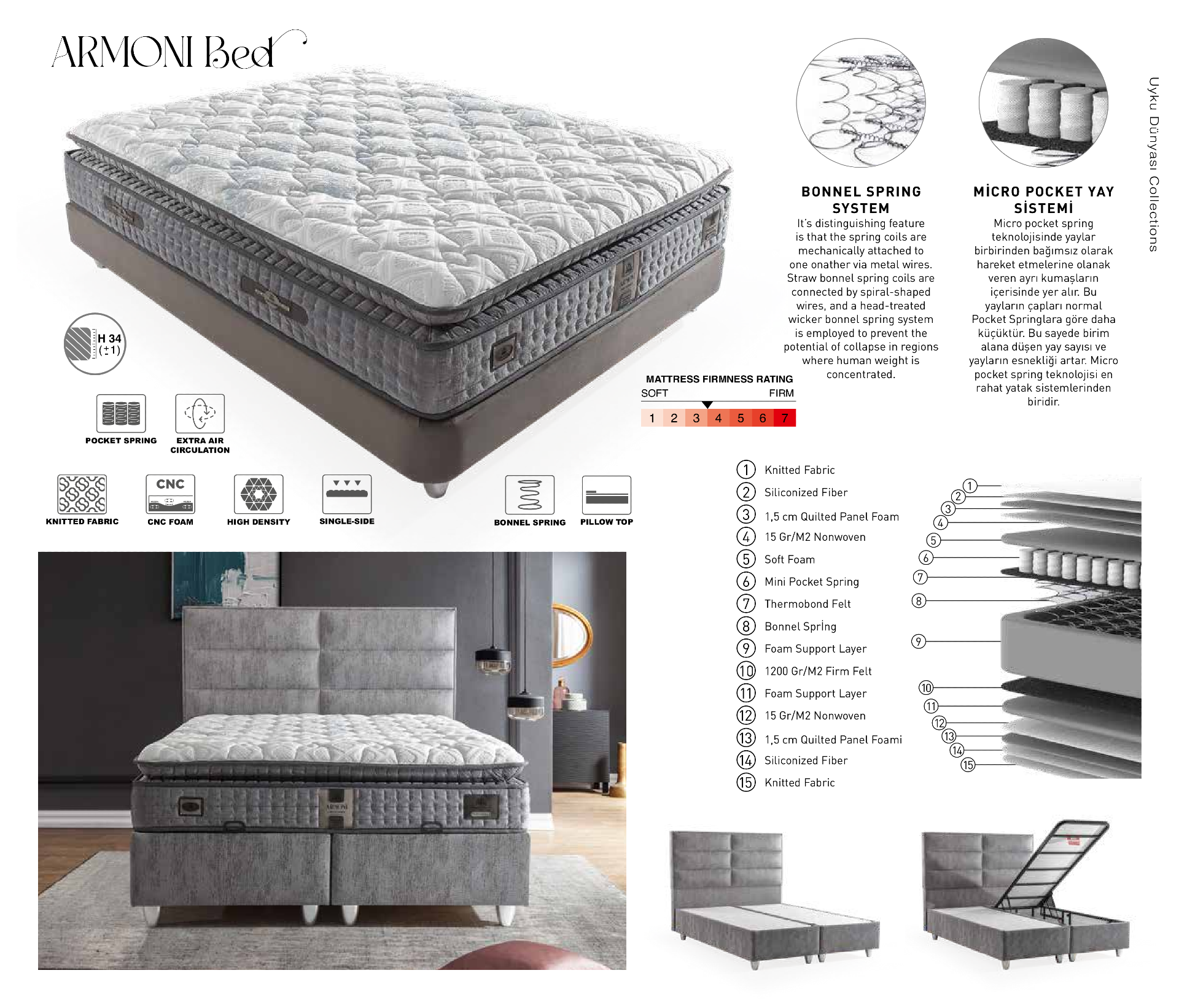 - Матрак Armoni е с двуслойно пружинно ядро, съставено от Bonnell Spring и Mini Pocket Spring пружинна система, обвити с борд от дунапрен с висока плътност и допълнени с омекотяващи слоеве от дунапрен, мека пяна и HR пяна за оптимален комфорт и стабилност.