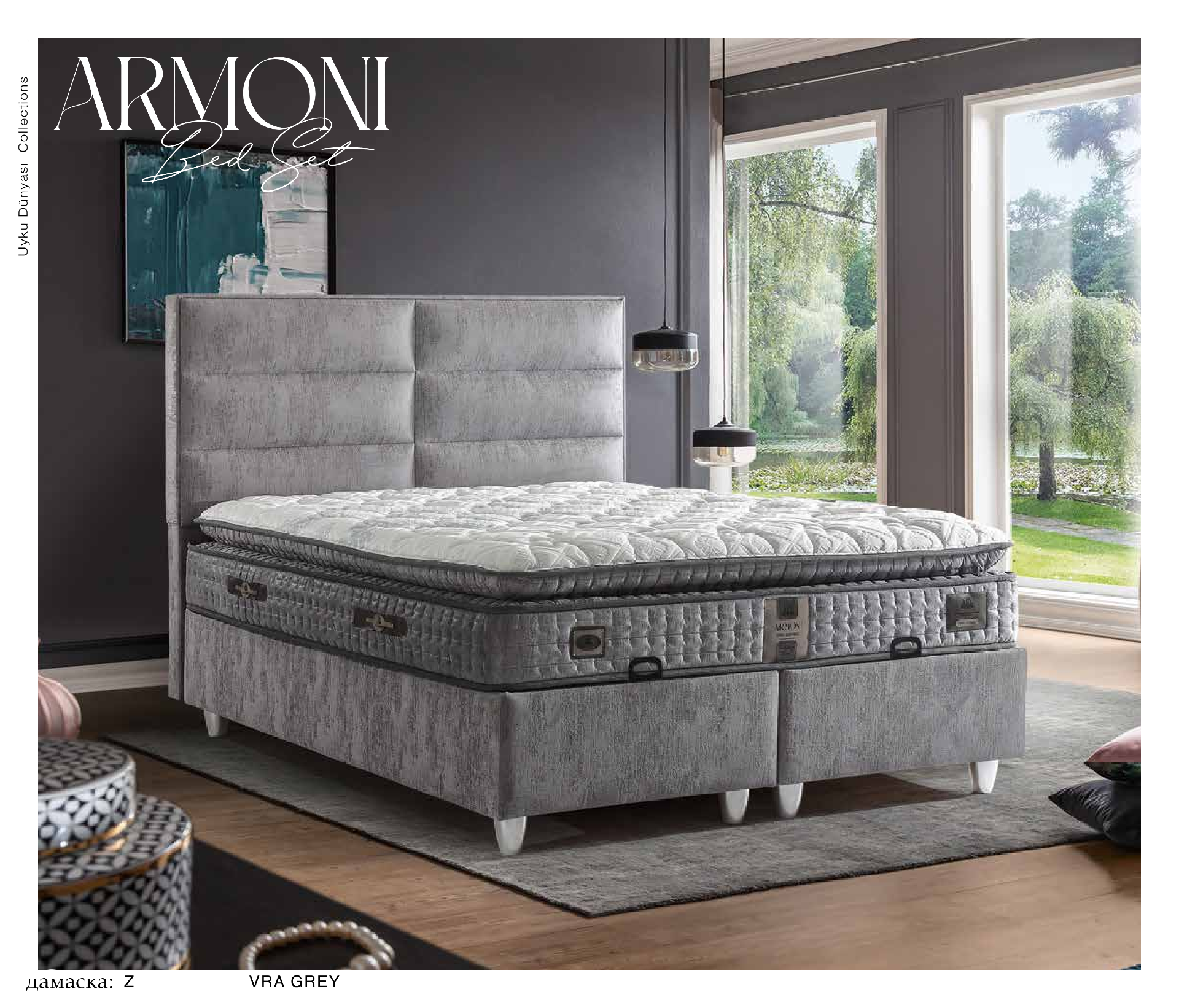 Тапицираното легло Armoni е впечатляващ дизайнерски модел, съчетаващ функционалност и елегантна модерна визия, проектиран с внимание към всеки детайл. Таблата и основата са тапицирани с висококачествена и устойчива мека дамаска Z VRA GREY, която създава усещане за стилен дизайн, изискан вкус и комфорт във всяка съвременна спалня. Тапицираната основа е оборудвана с повдигаща подматрачна система с газови амортисьори, която осигурява лесен и безпроблемен достъп до просторната вътрешна зона за съхранение – идеална за завивки, възглавници, спално бельо и други вещи, изискващи практично и дискретно подреждане.