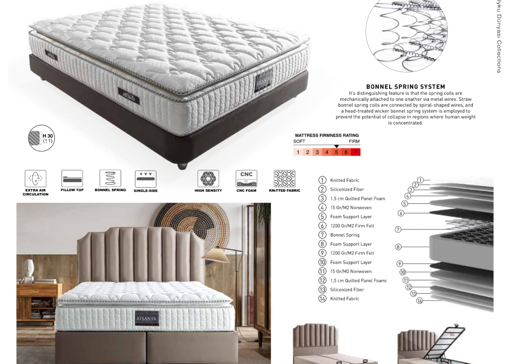 - Матрак Atlanta е с ядро от Bonel Spring пружинна система обвита с борд от дунапрен с висока плътност и допълнителни омекотяващи слоеве от дунапрен и HR пяна.