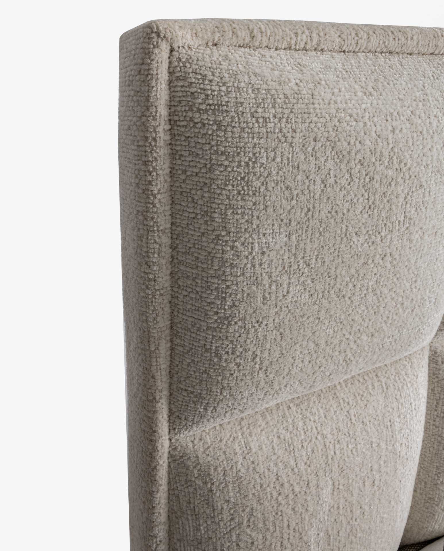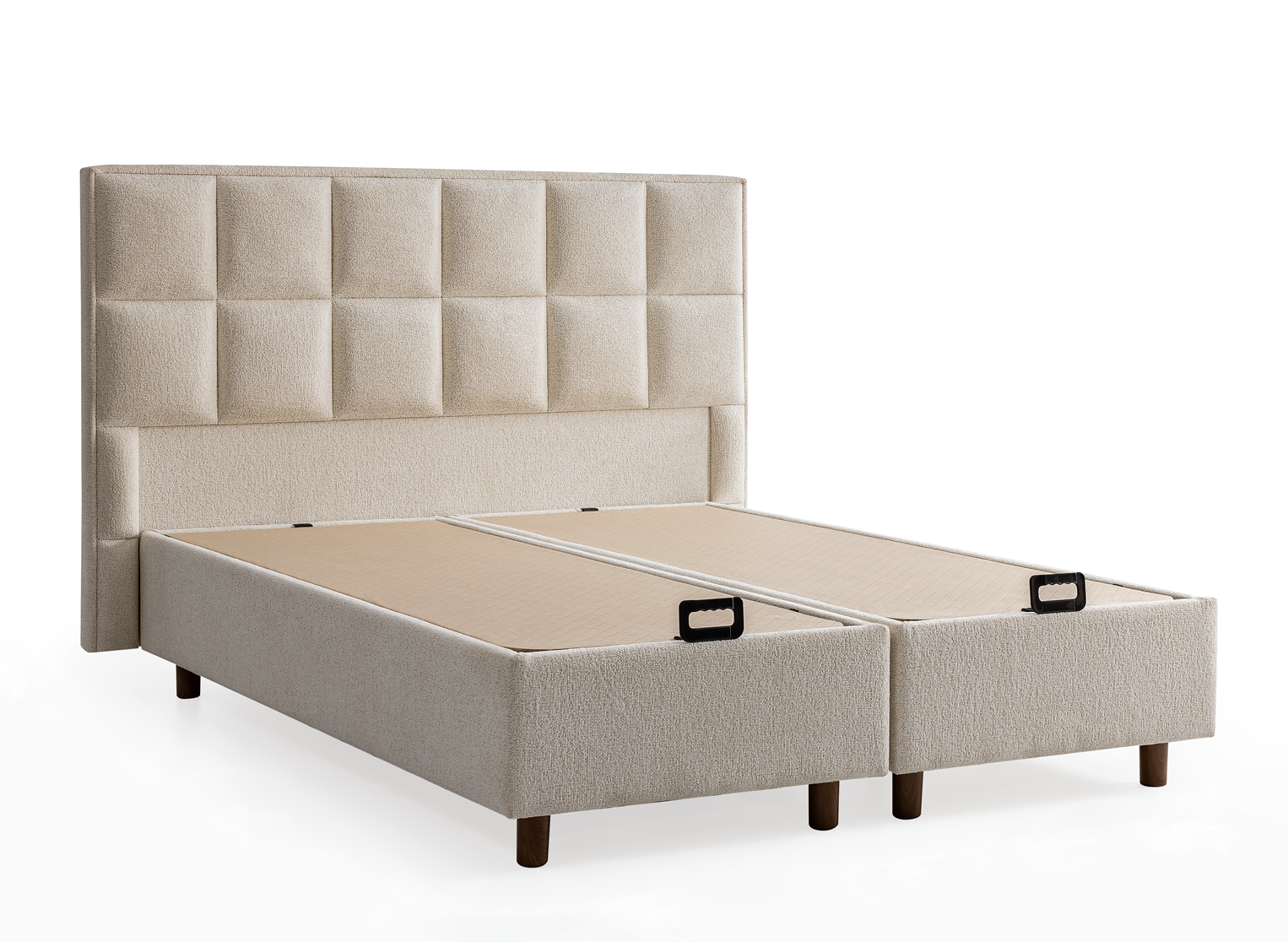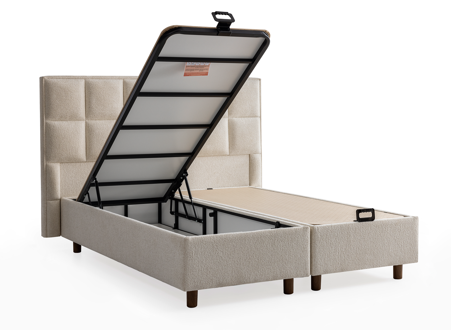 Тапицирано легло Atlas Перлено бяло се състои от голяма капитонирана табла и тапицирана основа с вградена повдигаща се подматрачна система с газови амортисьори. Конструкцията предлага просторно и практично място за съхранение на завивки, спално бельо и други вещи, като съчетава функционалност, елегантен дизайн и висок клас комфорт – идеално решение за съвременната спалня.