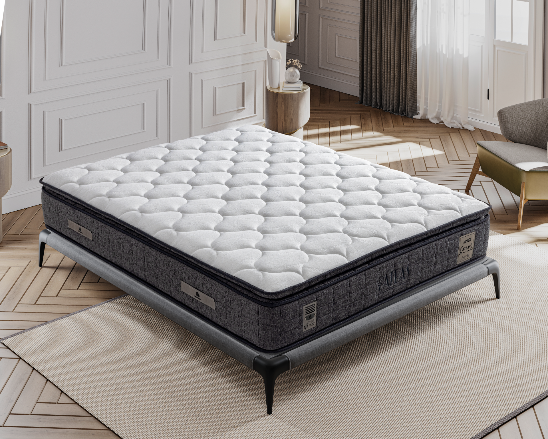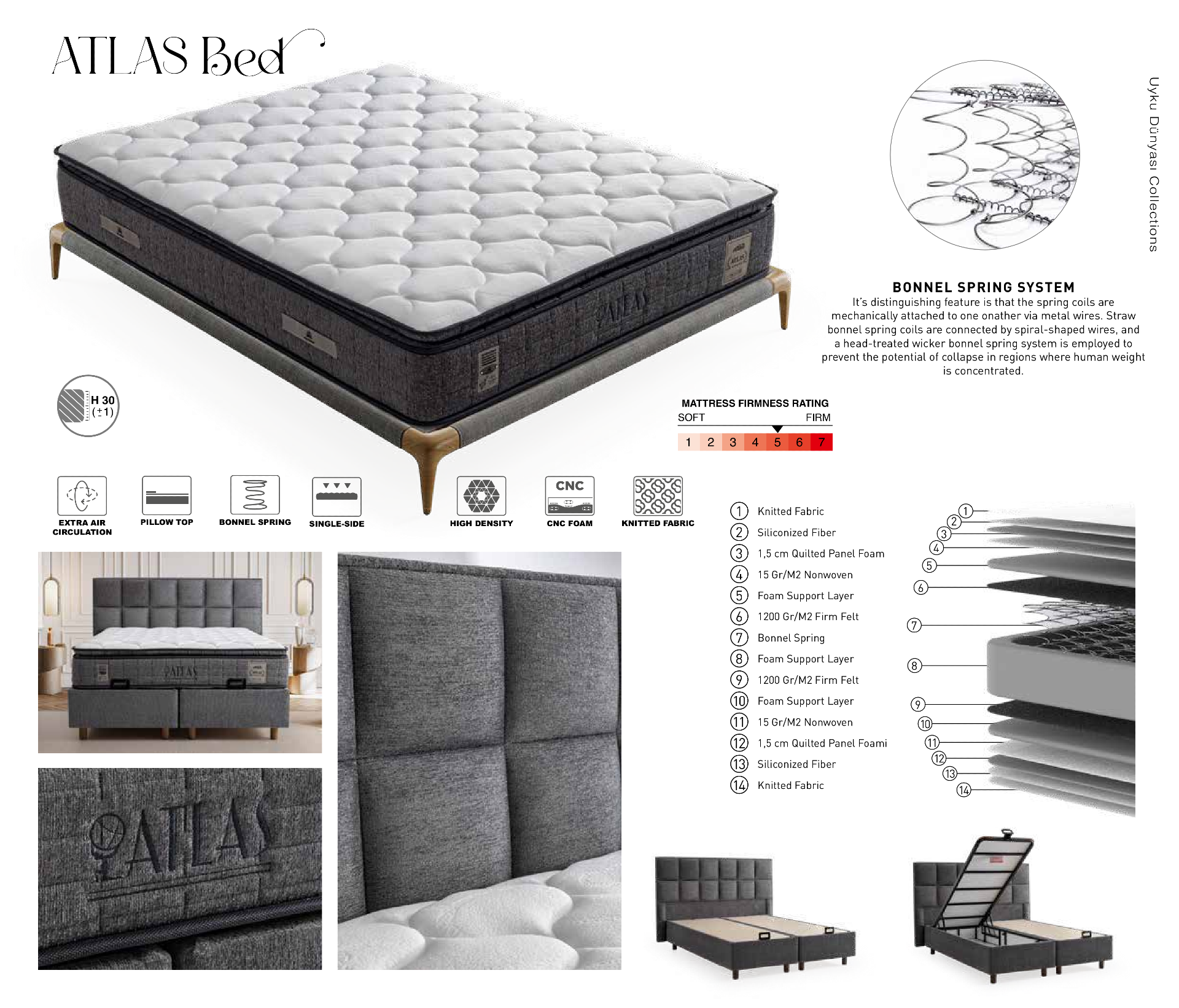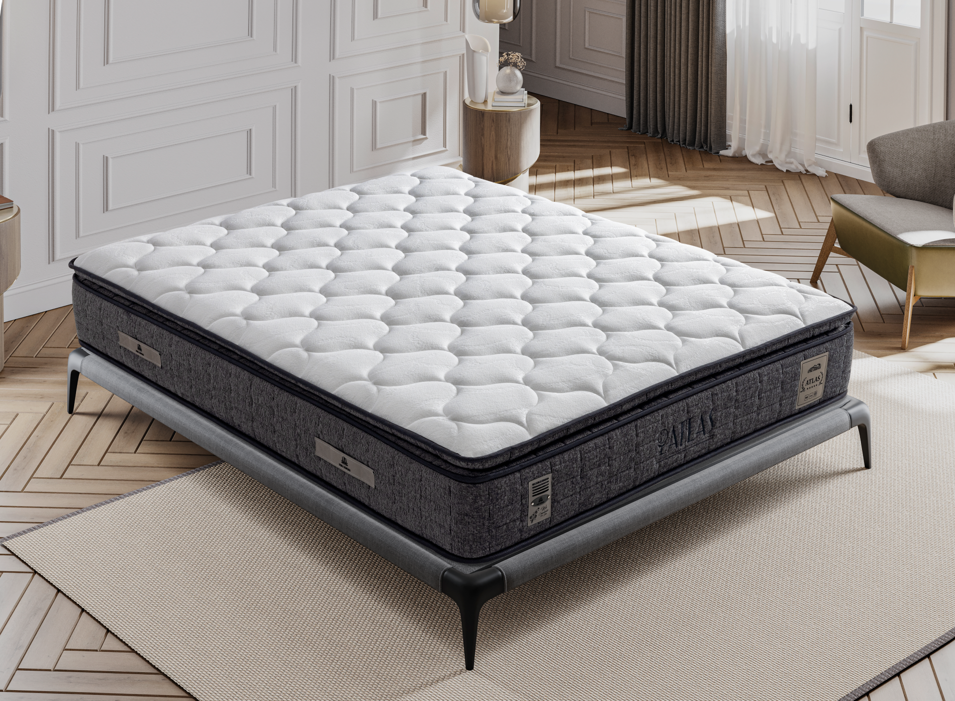 • Матрак Atlas е снабден комфортен прошит топ матрак и дишаща дизайнерска дамаска Knitted Fabrik.