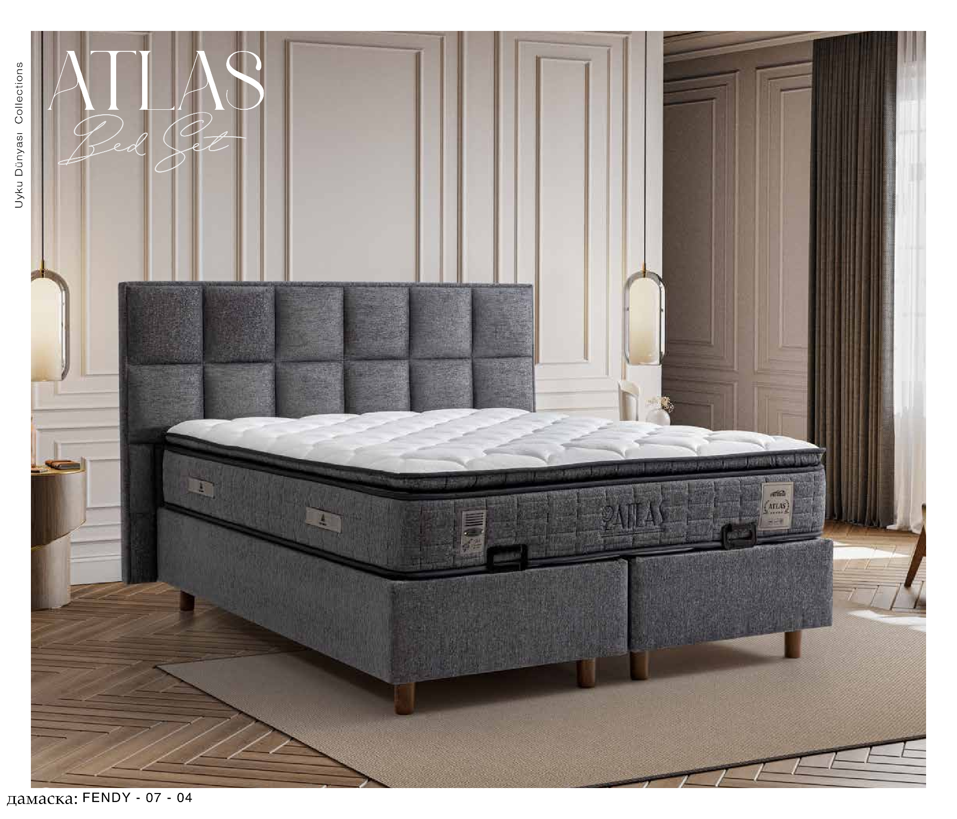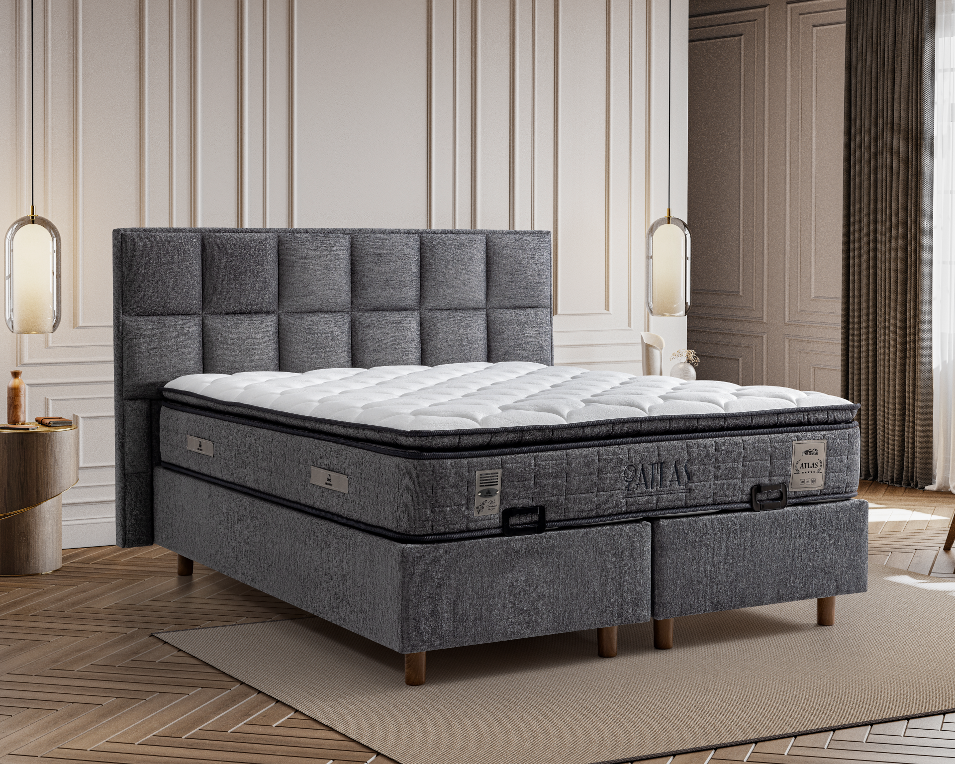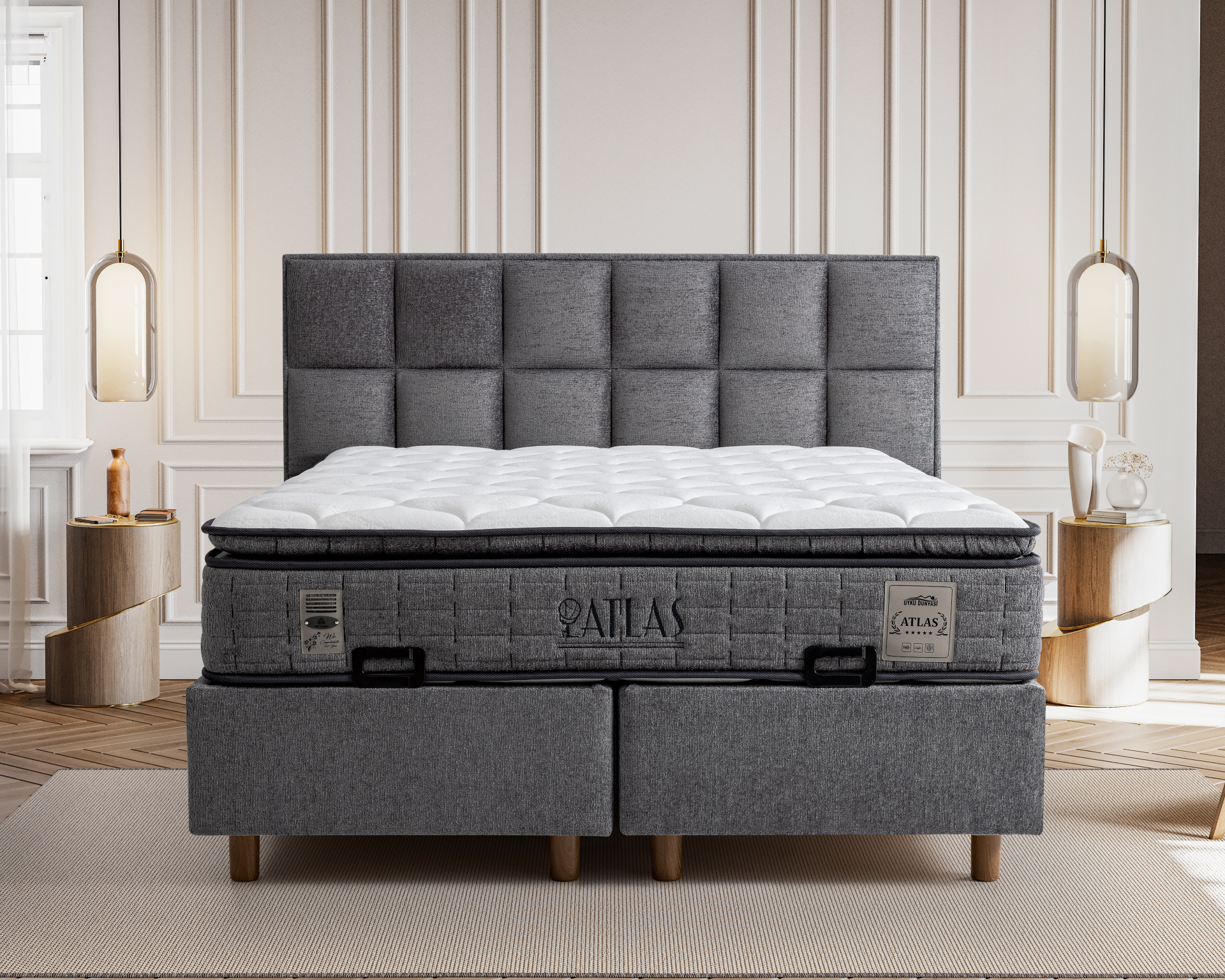 Тапицирано легло Atlas в цвят Графитено сиво, разполага с модерна капитонирана табла и основа оборудвана с вградена повдигаща се подматрачна система. Предлага се с опция за покупка без матрак или в комплект с матрак Atlas.