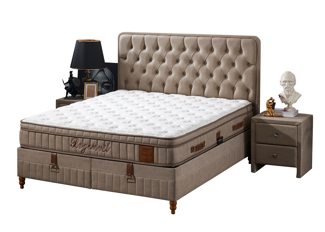 Тапицирано легло Begonvil е с капитонирана табла и основа, в отличаващ се модерен дизайн. Предлага се в комплект с матрак Begonvil, който е снабден с прошит топер и дизайнерска мека дамаска. В матрак Begonvil са вложени Pocket пружинна система, омекотяващи слоеве от дунапрен с висока плътност и DNS пяна. Може да се закупи и без матрака. Тапицирано легло Begonvil се предлага в 10 размера. Тапицирано легло Begonvil е модулно, готов вариант в комплект с капитонирана основа, капитонирана табла и матрак. Тапицираната спалня Begonvil е снабдено с нов модел повдигаща се подматрачна рамка.