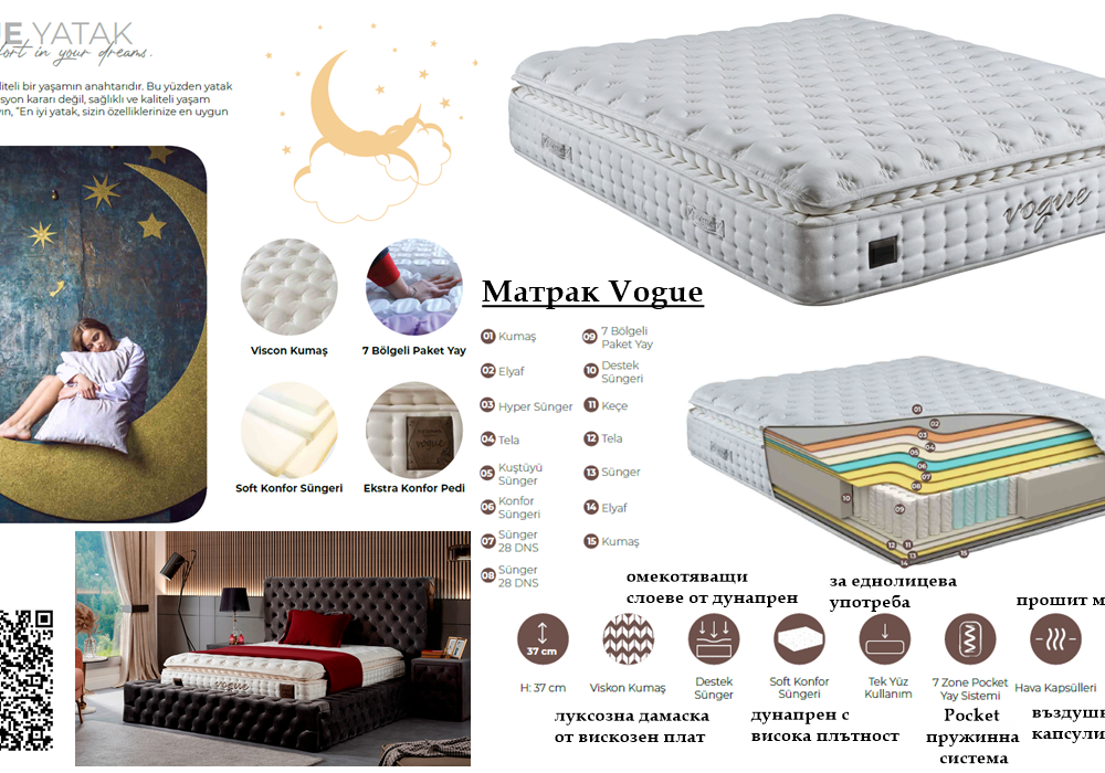 Матрак Vogue има ядро от 7 Zone Pocket пружинна система, допълнено със слоеве от високоплътен дунапрен, омекотителна вата, ортопедична пяна, DNS пяна и силиконизирани влакна, които осигуряват комфортна и балансирана опора. Балансиращата система защитава извивките на гръбначния стълб, като поддържа кръста, гърба, главата, врата и коленете, а благодарение на дизайнерската дамаска от вискозен плат (Viscose fabric), прошития топер и въздушните капсули по цялата повърхност, матракът гарантира свежа и хигиенична среда без изпотяване.