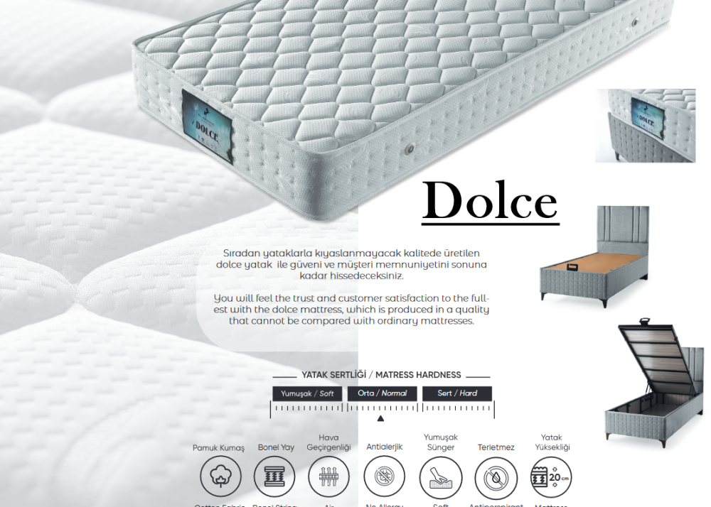 Матрак Dolce е с ядро от динамична пружина система Bonel. Добавени са допълнителни омекотяващи слоеве от висококачествен дунапрен / пяна с висока плътност, вата и силиконизирани влакна. Матрак Dolce притежава ортопедични свойства, защитава извивките на гръбначния стълб и намалява натиска върху тялото. Поддържа и разпределя равномерно тежестта на тялото, кръста, гърба, главата, врата и областта на коленете, върху цялата повърхност на матрака.