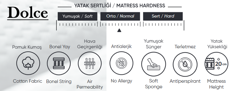 Матрак Dolce е с ядро от динамична пружина система Bonel. Добавени са допълнителни омекотяващи слоеве от висококачествен дунапрен / пяна с висока плътност, вата и силиконизирани влакна. Матрак Dolce притежава ортопедични свойства, защитава извивките на гръбначния стълб и намалява натиска върху тялото. Поддържа и разпределя равномерно тежестта на тялото, кръста, гърба, главата, врата и областта на коленете, върху цялата повърхност на матрака.