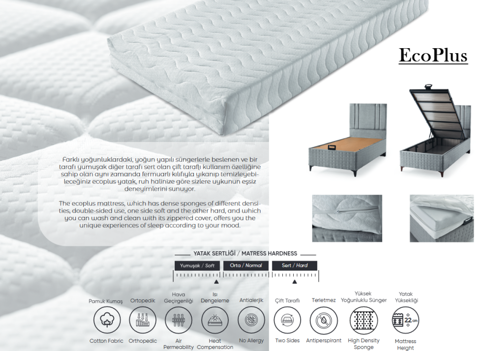 Матрак EcoPlus е дунапренов ортопедичен матрак. С ядро от висококачествен дунапрен с висока плътност от едната страна, ортопедичен дунапрен от другата страна и силиконизирани влакна. Ядрото е обвито с вътрешен калъф, като допълнително е снабден с външен сваляем калъф с цип. Матрак EcoPlus притежава ортопедични свойства и две страни на различен комфорт и твърдоост. Защитава извивките на гръбначния стълб и намалява натиска върху тялото. Поддържа и разпределя равномерно тежестта на тялото, кръста, гърба, главата, врата и областта на коленете, върху цялата повърхност на матрака.