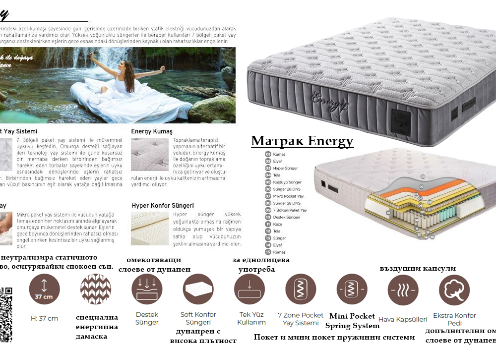 Матрак Energy е с двуслойно пружинно ядро, в комбинация между един ред Pocket пружинна система – Spring System, над нея втори ред от Mini Pocket пружинна система. Добавени са омекотяващи слоеве от висококачествен дунапрен с висока плътност, омекотителна вата, DNS пяна и силиконизирани влакна. Матрак с балансираща система, която защитава извивките на гръбначния стълб, като поддържа кръста, гърба, главата, врата и областта на коленете. Матрак Energy е снабден със специална антистатична дамаска, която неутрализира статичното електричество и осигурявайки спокоен сън. Също така предотвратява изпотяването благодарение на въздушните капсули / канали по цялата повърхност.