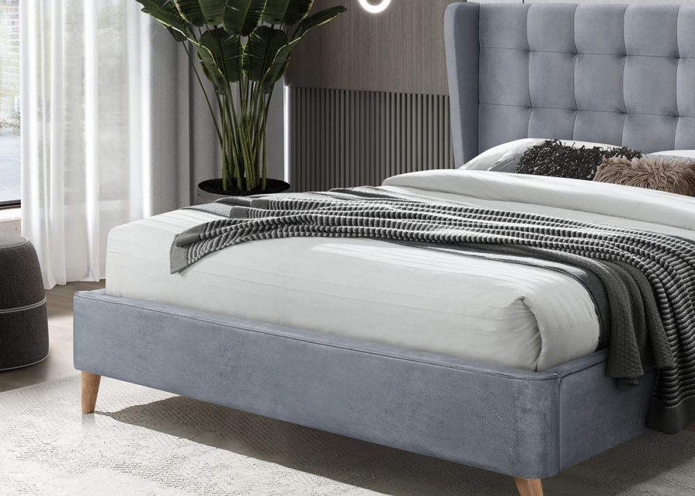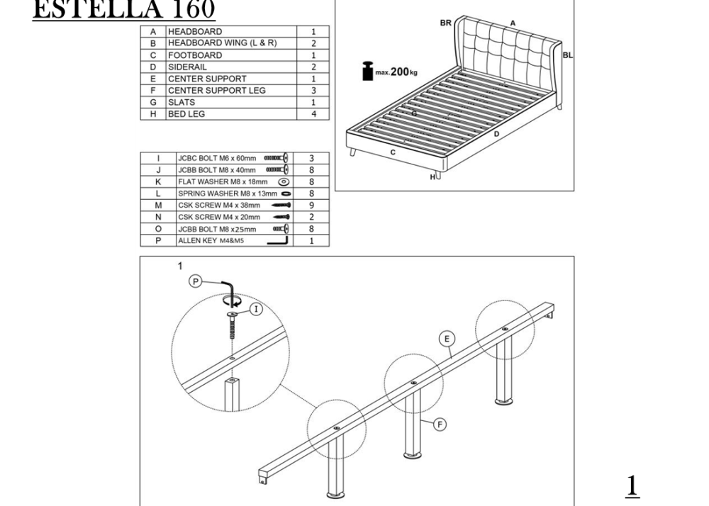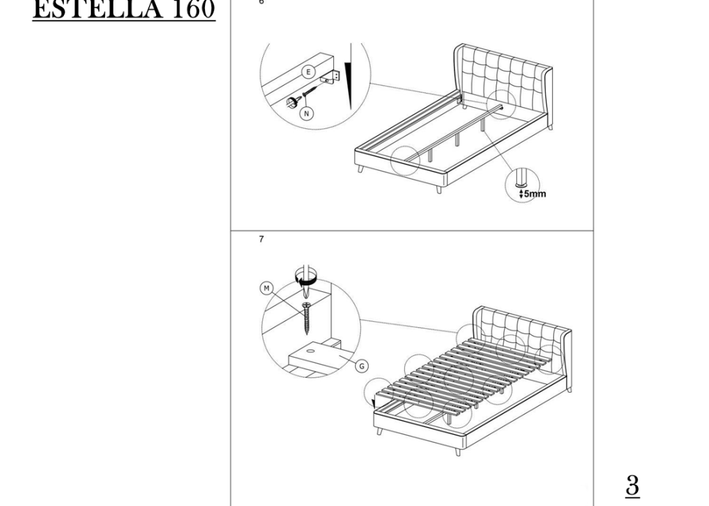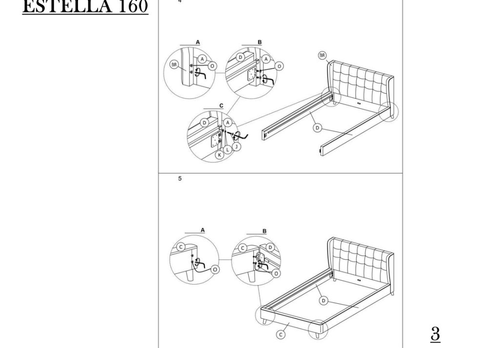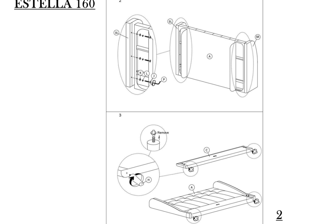 Спалното легло Estella представлява основа от MDF / масивна дървесна конструкция и голяма табла за главата. Основата и таблата на тапицирано легло Estella, са капитонирани с висококачествена кадифена дамаска. Спалнята е снабдена с устойчива дървена подматрачна рамка и елегантни крачета. Не притежава повдигаща подматрачна рамка.