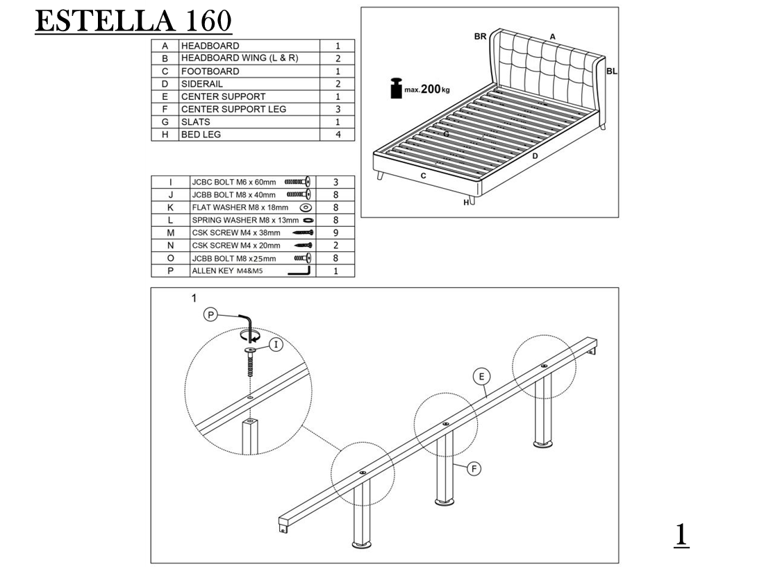 Спалното легло Estella представлява основа от MDF / масивна дървесна конструкция и голяма табла за главата. Основата и таблата на тапицирано легло Estella, са капитонирани с висококачествена кадифена дамаска. Спалнята е снабдена с устойчива дървена подматрачна рамка и елегантни крачета. Не притежава повдигаща подматрачна рамка.