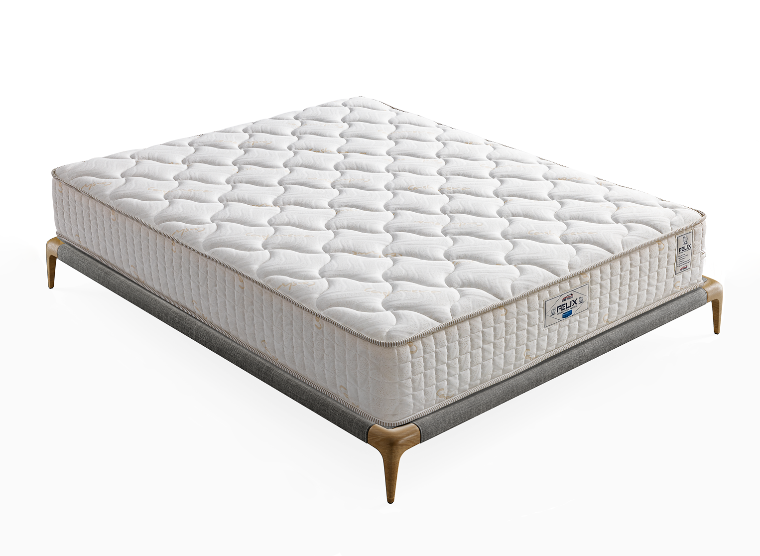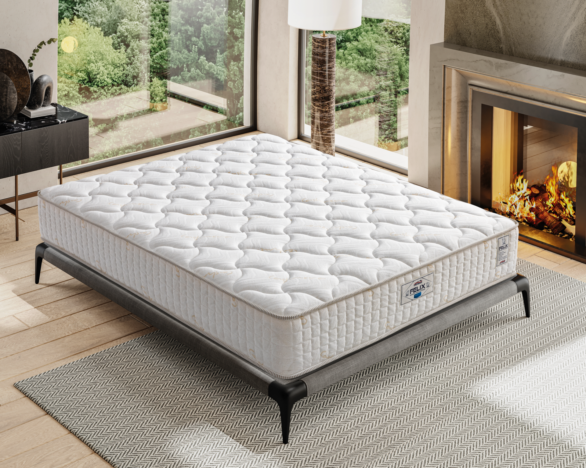 - Матракът Felix разполага с ядро от Pocket Spring пружинна система, обвито с борд от дунапрен с висока плътност и допълнителни омекотяващи слоеве от омекотителна вълна, дунапрен, мека пяна и HR пяна, които осигуряват стабилност, ортопедична опора и дълготраен комфорт по време на сън. Завършен е с луксозна дишаща дамаска Knitted Fabric, която съчетава стил, проветривост и естетична визия, подходяща за всяка модерна спалня.
