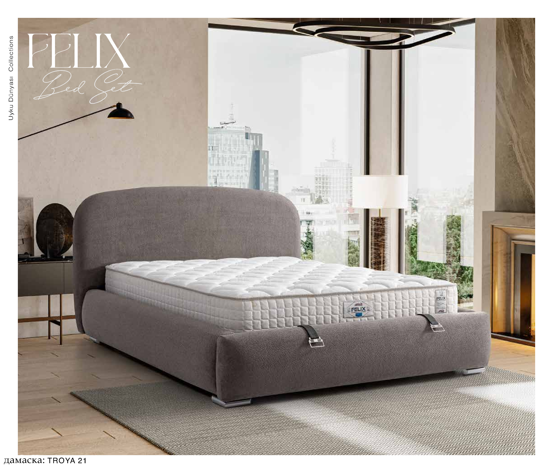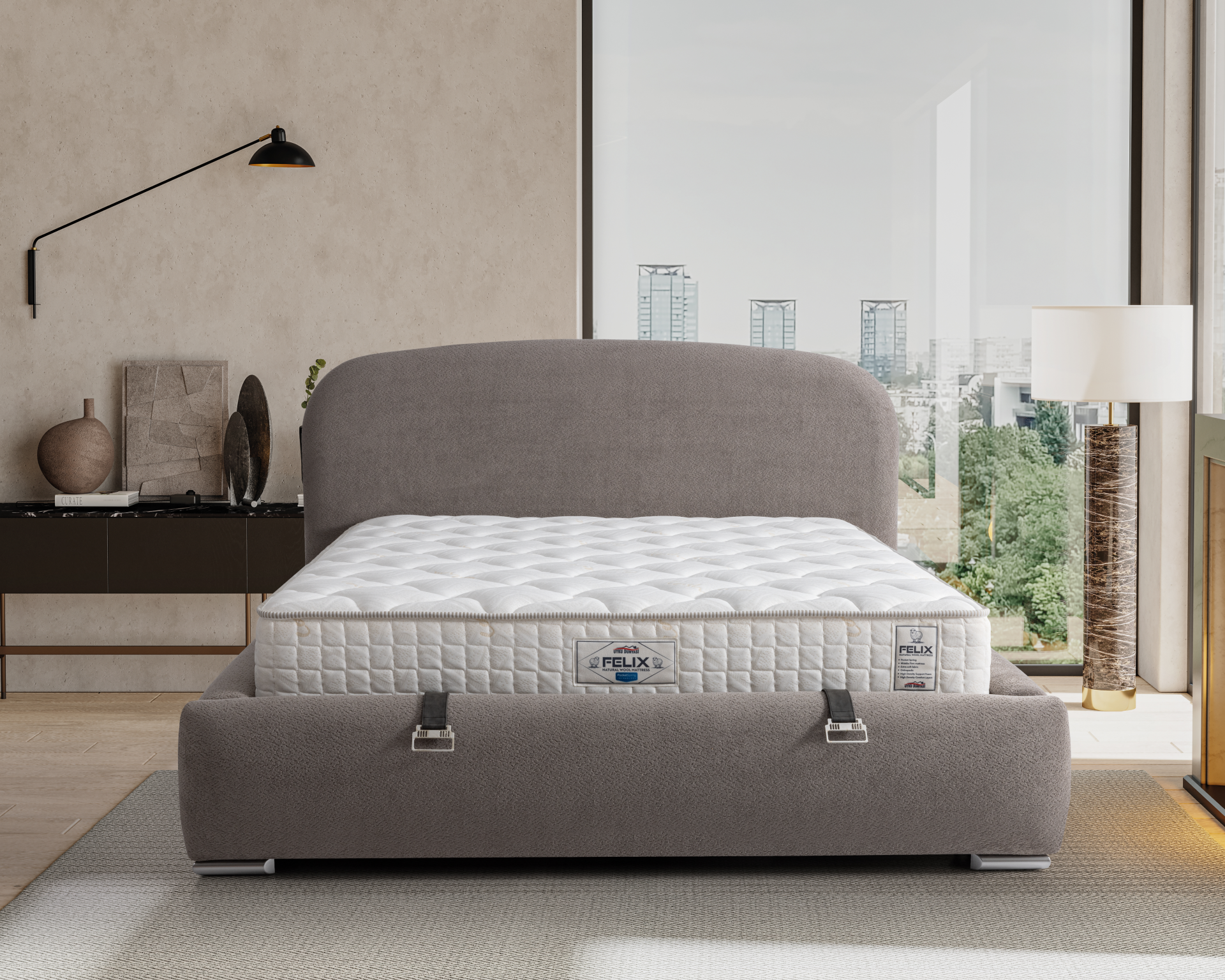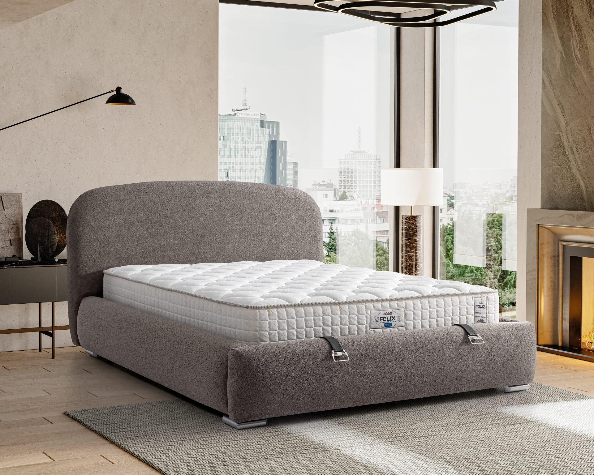 Тапицираното легло Felix в изискан кварцово сив цвят впечатлява с луксозен дизайн и високо ниво на комфорт. Спалнята е капитонирана с висококачествена дамаска TROYA 21, която придава усещане за уют, елегантност и модерен стил – идеален завършек за всяка съвременна спалня. Моделът е оборудван с елегантна капитонирана табла и тапицирана основа с вградени кожени дръжки, които улесняват повдигането на подматрачната рамка. Основата разполага с вградена повдигаща се подматрачна система с газови амортисьори, осигуряваща просторно и практично място за съхранение на завивки, възглавници, спално бельо и други вещи.