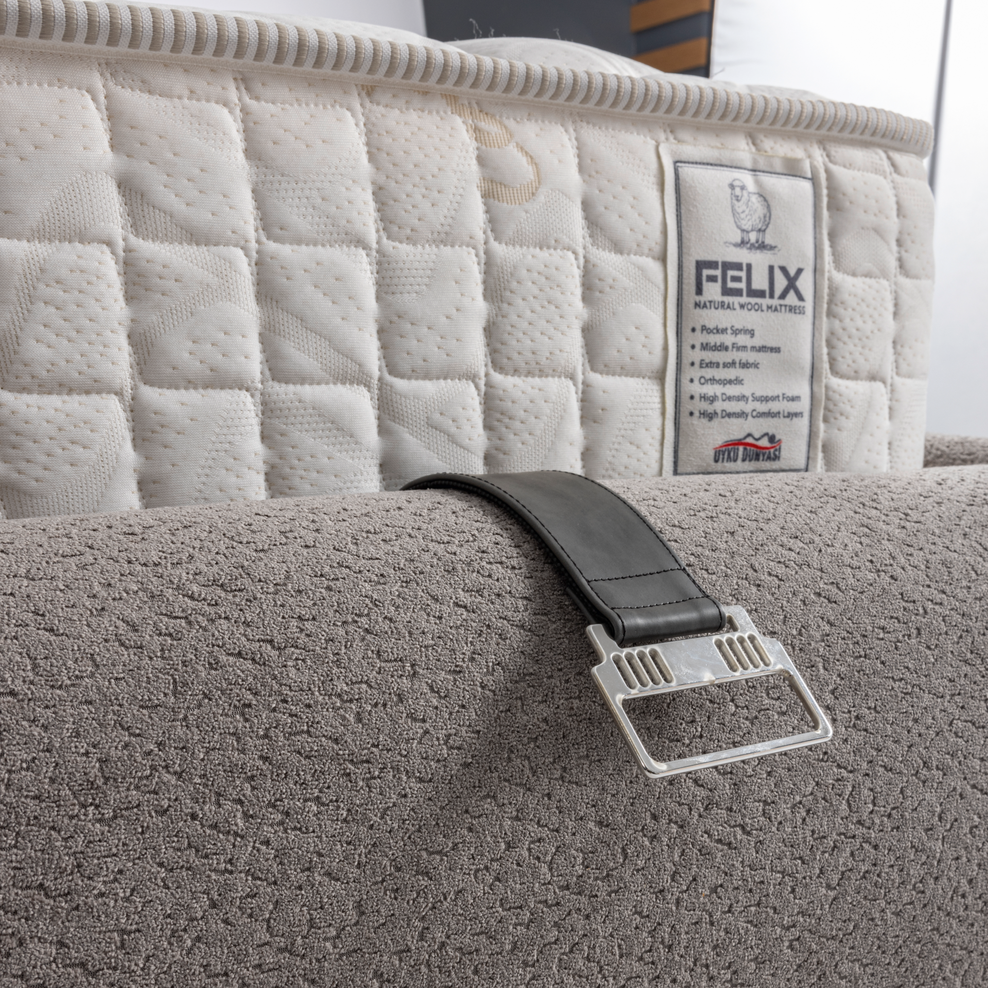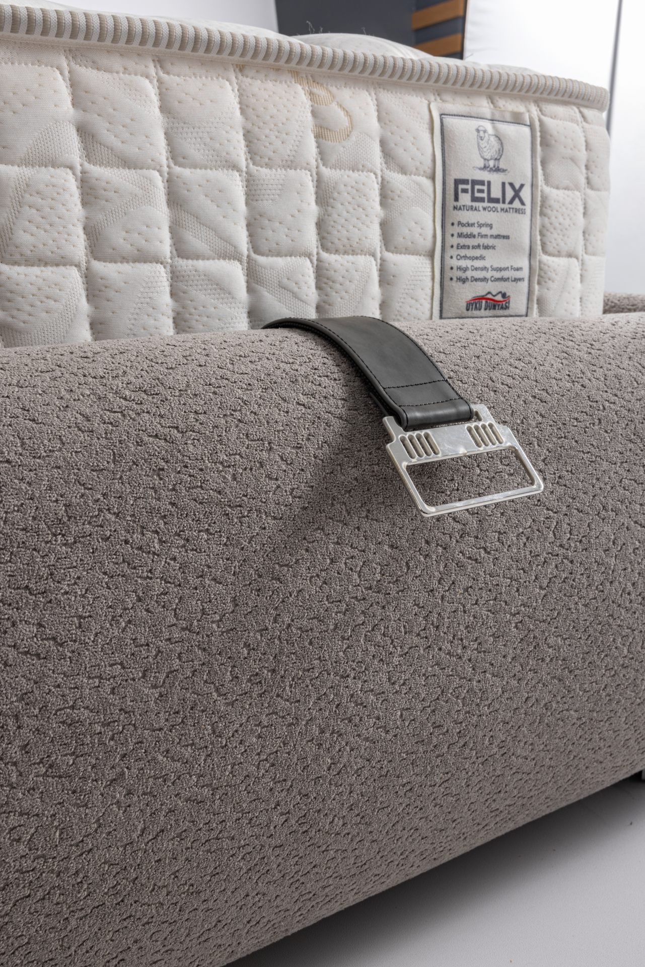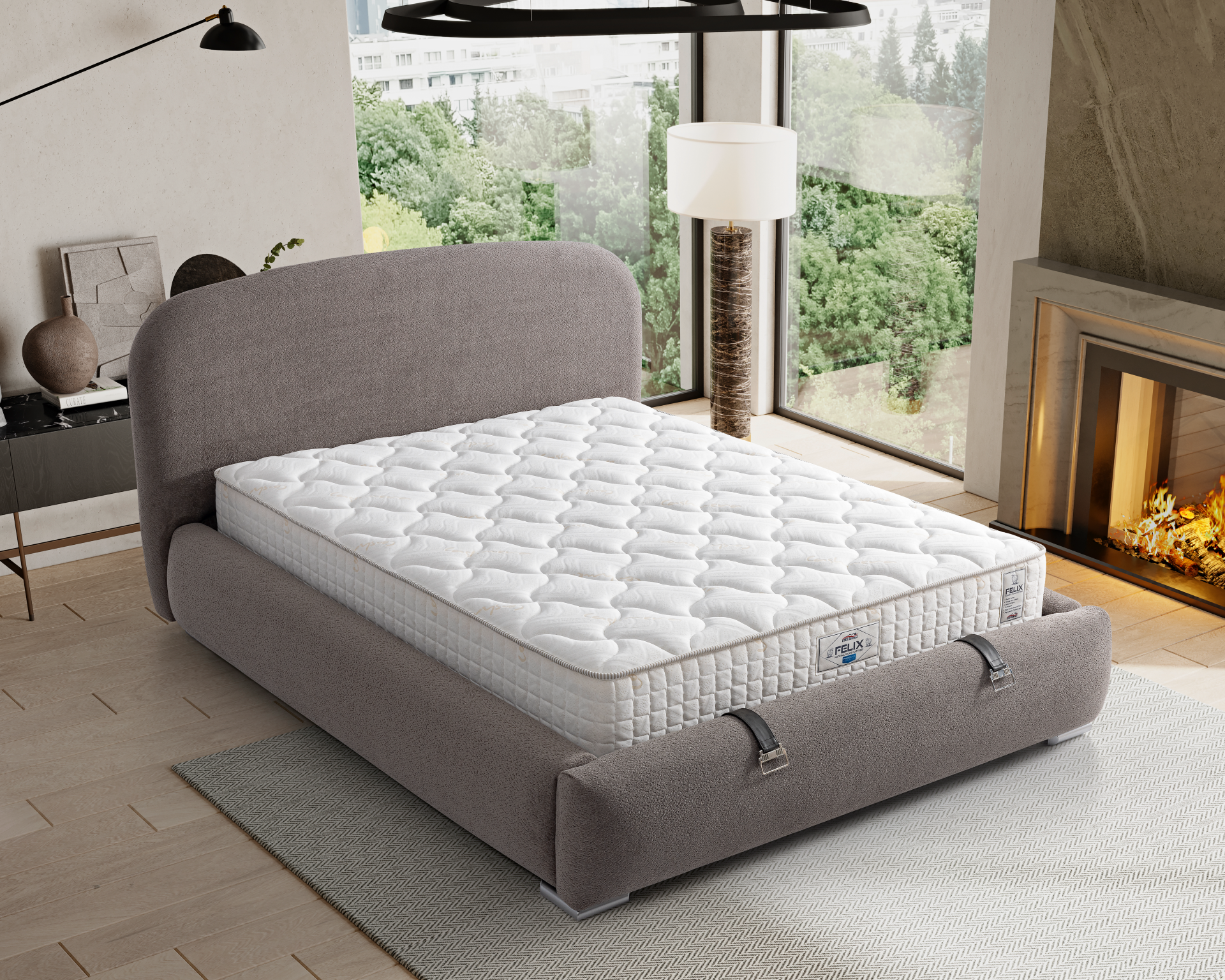 Тапицираното легло Felix в изискан кварцово сив цвят впечатлява с луксозен дизайн и високо ниво на комфорт. Спалнята е капитонирана с висококачествена дамаска TROYA 21, която придава усещане за уют, елегантност и модерен стил – идеален завършек за всяка съвременна спалня. Моделът е оборудван с елегантна капитонирана табла и тапицирана основа с вградени кожени дръжки, които улесняват повдигането на подматрачната рамка. Основата разполага с вградена повдигаща се подматрачна система с газови амортисьори, осигуряваща просторно и практично място за съхранение на завивки, възглавници, спално бельо и други вещи.