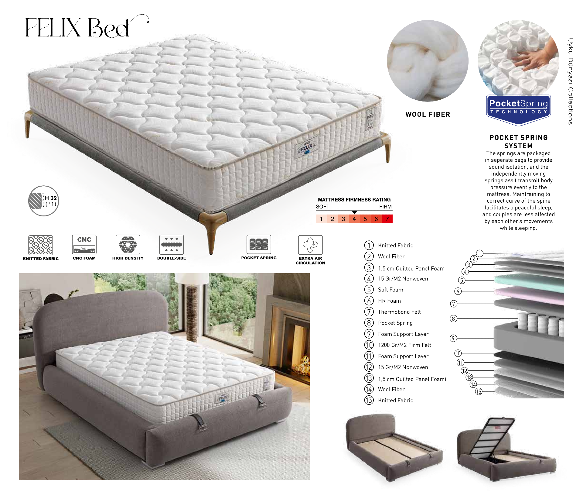 - Матрак Felix е с ядро от Pocket Spring пружинна система обвита с борд от дунапрен с висока плътност и допълнителни омекотяващи слоеве от омекотителна вълна, дунапрен, слой от мека пяна и HR пяна.
