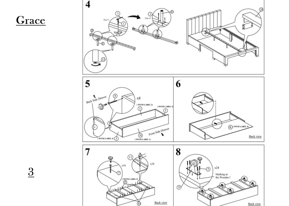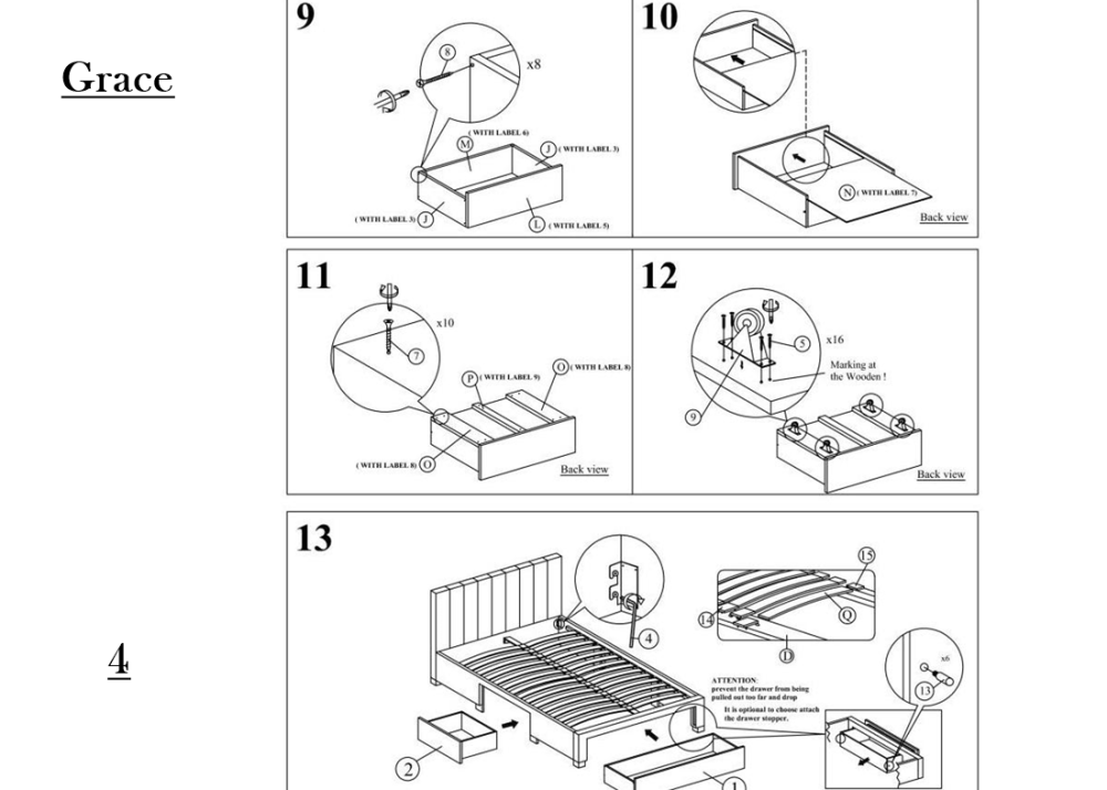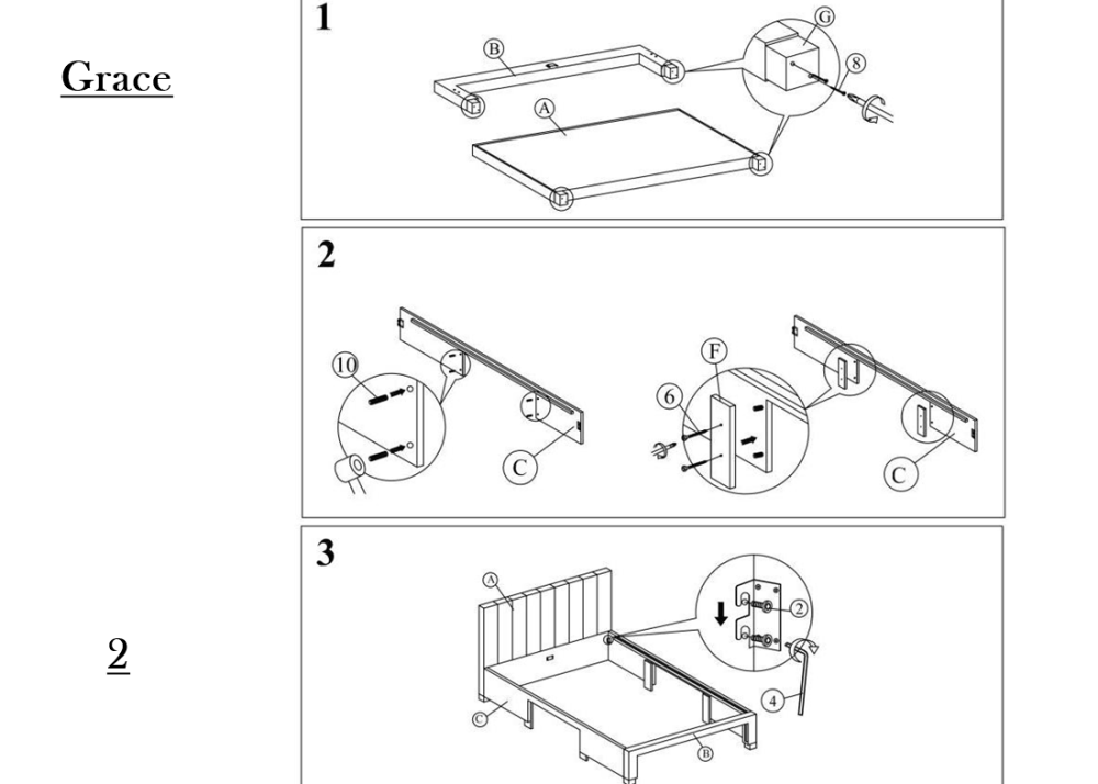 Тапицирано легло Grace е функционално спално легло с 3-три чекмеджета. Конструкцията е здрава и устойчива, изработва се от MDF / масивно каучуково дърво. Състои се от стабилна основа, табла и три чекмеджета. Тапицирано легло Grace е снабдено 3бр чекмеджетата и ламелна дървена подматрачна рамка.