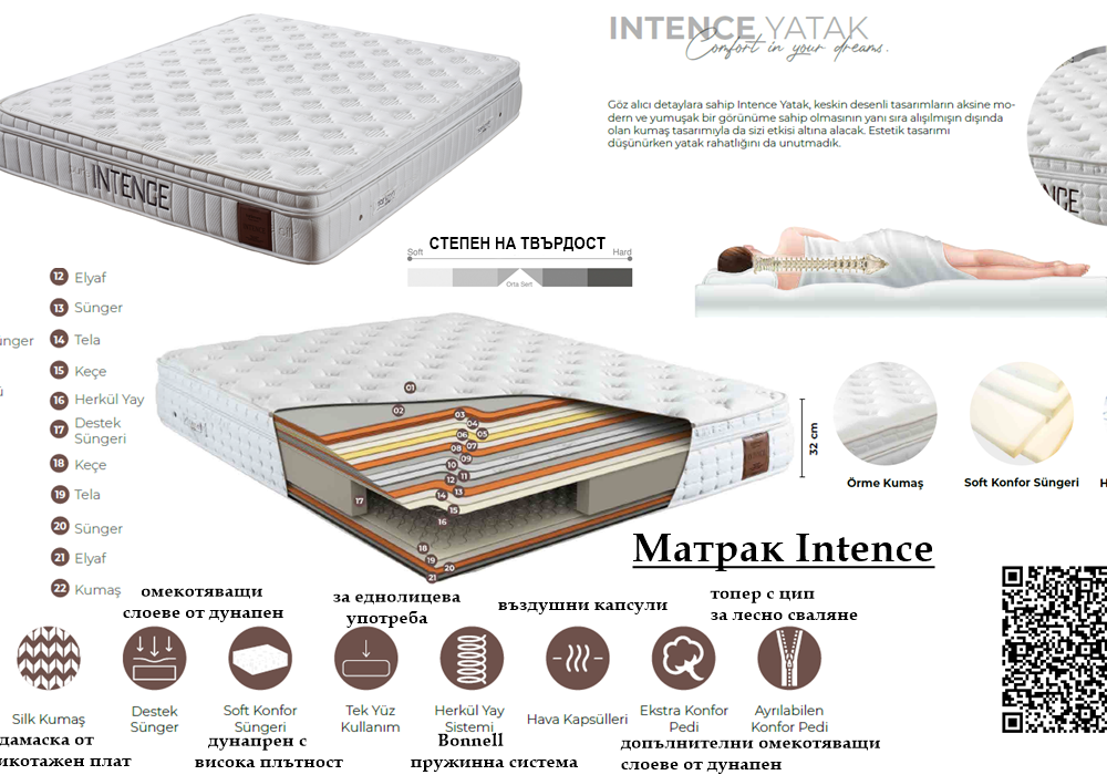 • Матрак Intence е със сваляем топ матрак и дизайнерска дамаска от трикотажен плат. Антибактериална дамаска, осигуряваща защита срещу акари.