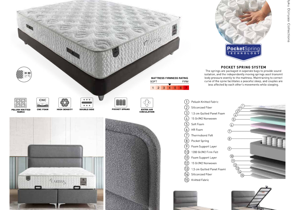 • Матрак Larissa е с ядро от Pocket Spring пружинна система обвита с борд от дунапрен с висока плътност и допълнителни омекотяващи слоеве от дунапрен, слой от мека пяна и HR пяна.