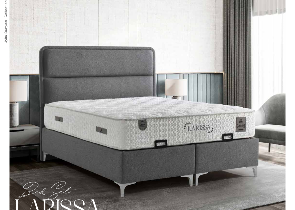 Тапицирано легло Larissa притежава елегантна капитонирана табла и основа с вградена повдигащ се подматрачна място рамка. Предлага се с опция за покупка без матрак или в комплект с матрак Larissa.