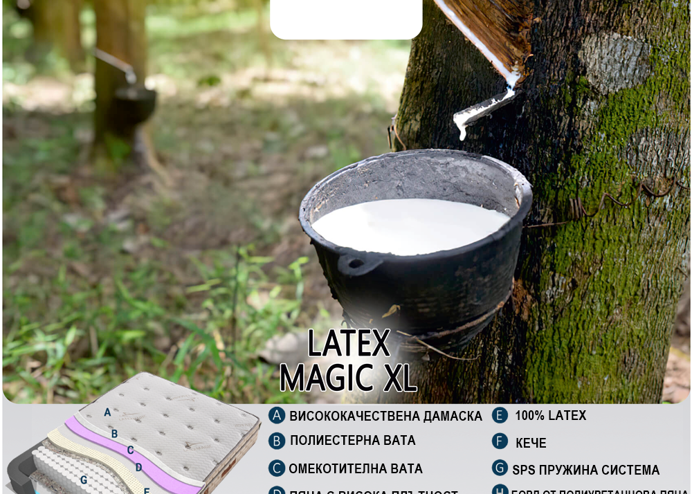 Матрак Latex Magic XL е с ядро от SpS pocket пружинна система – SPS Pocket Spring System. Над нея е добавен слой от 100% Latex и допълнителни омекотяващи слоеве от висококачествени дунапрен, полиестерна вата, омекотителна вата, HDS пяна с висока плътност и силиконизирани влакна. Матрак с балансираща система, която защитава извивките на гръбначния стълб, като поддържа кръста, гърба, главата, врата и областта на коленете. Матрак Latex Magic XL е снабден с луксозна дишаща дамаска с висока плътност, която предотвратява изпотяването благодарение на въздушните канали по цялата повърхност.