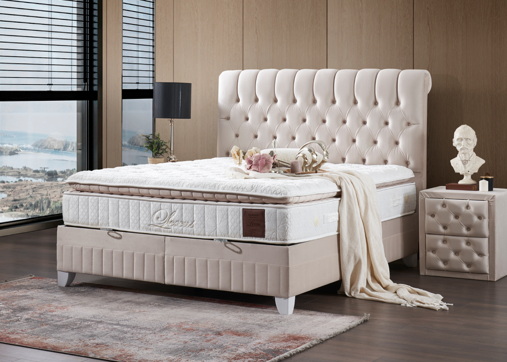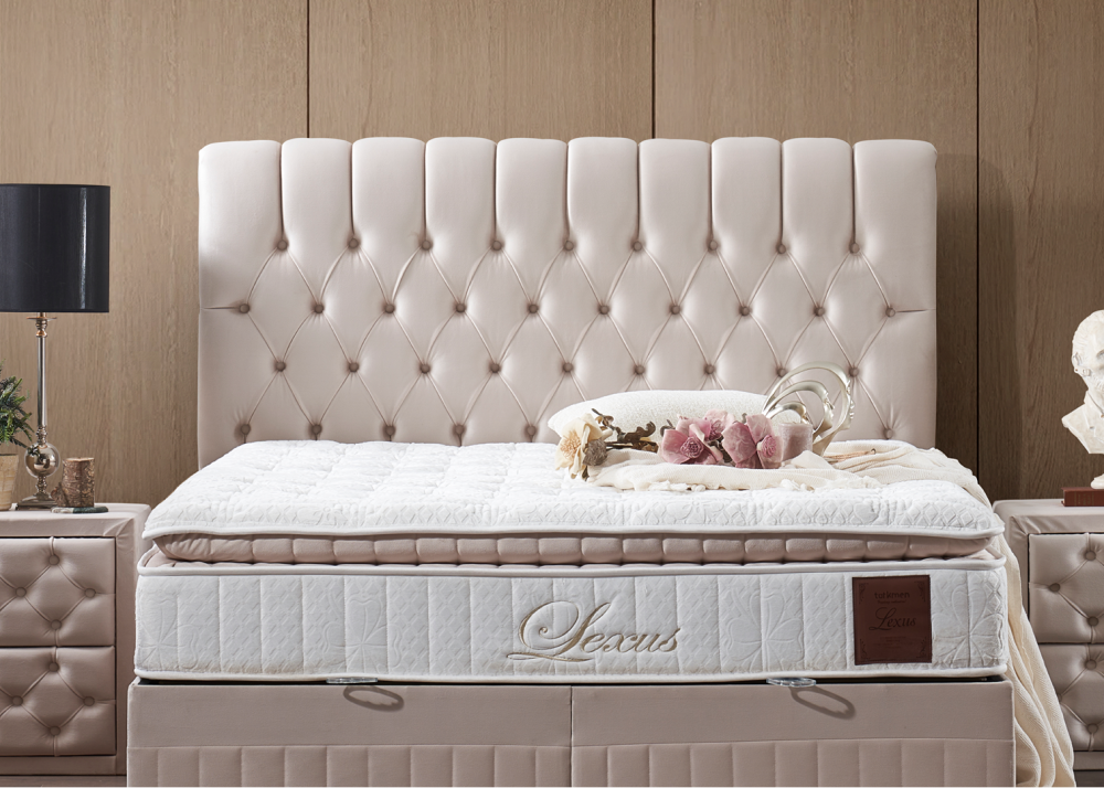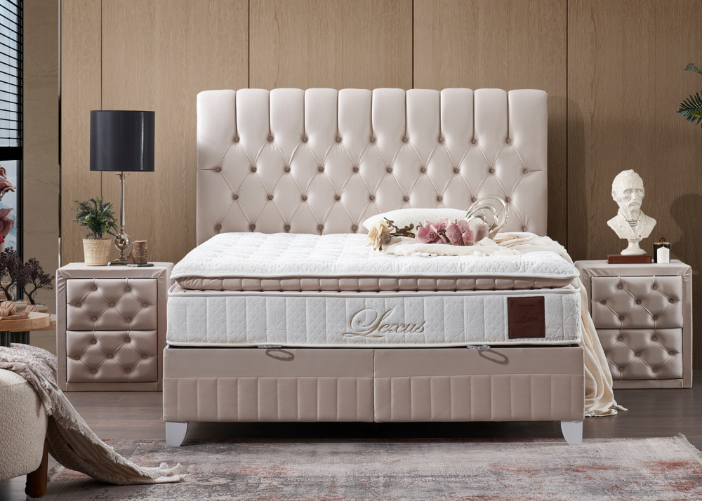 Тапицирано легло Lexus – основата / базата представлява стабилна и устойчива метална конструкция обвита с ламинирано ПДЧ, тапицирана е с качествена дамаска. Таблата също се изработва от ламиниран ПДЧ материал, капитонирана е с висококачествена дамаска. Основата е снабдена с дъно и нов модел повдигаща система от 1бр / (2бр за двойните размери) метална подматрачна рамка с цял ламиниран ПДЧ панел. Рамката е оборудвана с 2бр / 4бр газови амортисьори /2х2/ по 750N, има спирачка на механизма, която може да се ползва когато механизма е отворен. На дъното и рамката са монтирани вентилационни капачки. Основата предоставя голямо празно подматрачно пространство, подходящо за съхранение на спални завивки и други вещи.