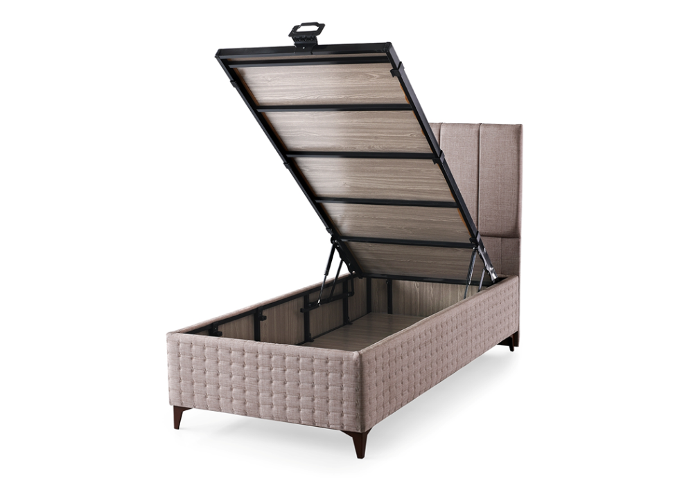 - Базата е снабдена с дъно и нов модел повдигаща система от 1бр (за единичните размери) / 2бр метална подматрачна рамка с цял ламиниран ПДЧ панел. Рамката е оборудвана с 2бр / 4бр газови амортисьори /2х2/ по 750N, може да се повдига всяка основа по отделно или заедно, има спирачка на механизма, която може да се ползва когато механизма е отворен. На дъното и рамката са монтирани вентилационни капачки. Основата предоставя голямо празно подматрачно пространство, подходящо за съхранение на спални завивки и други вещи.