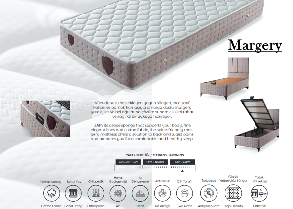 Матрак Margery е с ядро от динамична пружина система Bonel. Добавени са допълнителни омекотяващи слоеве от висококачествен дунапрен / пяна с висока плътност, вата и силиконизирани влакна. Матрак Margery притежава ортопедични свойства, защитава извивките на гръбначния стълб и намалява натиска върху тялото. Поддържа и разпределя равномерно тежестта на тялото, кръста, гърба, главата, врата и областта на коленете, върху цялата повърхност на матрака.