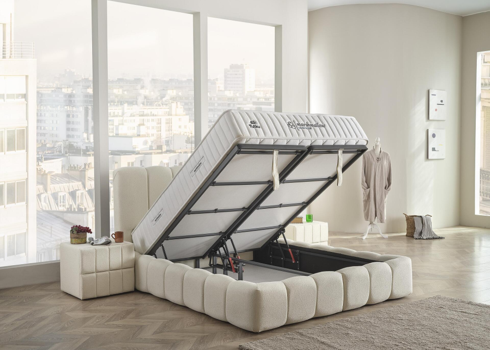 Тапицираното легло Marshmallow е модулен модел, съчетаващ стилен дизайн, практичност и комфорт. Включва капитонирана табла и основа с вградена подматрачна рамка, снабдена с газови амортисьори и просторно място за съхранение на спално бельо, завивки и други вещи.