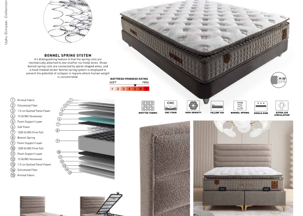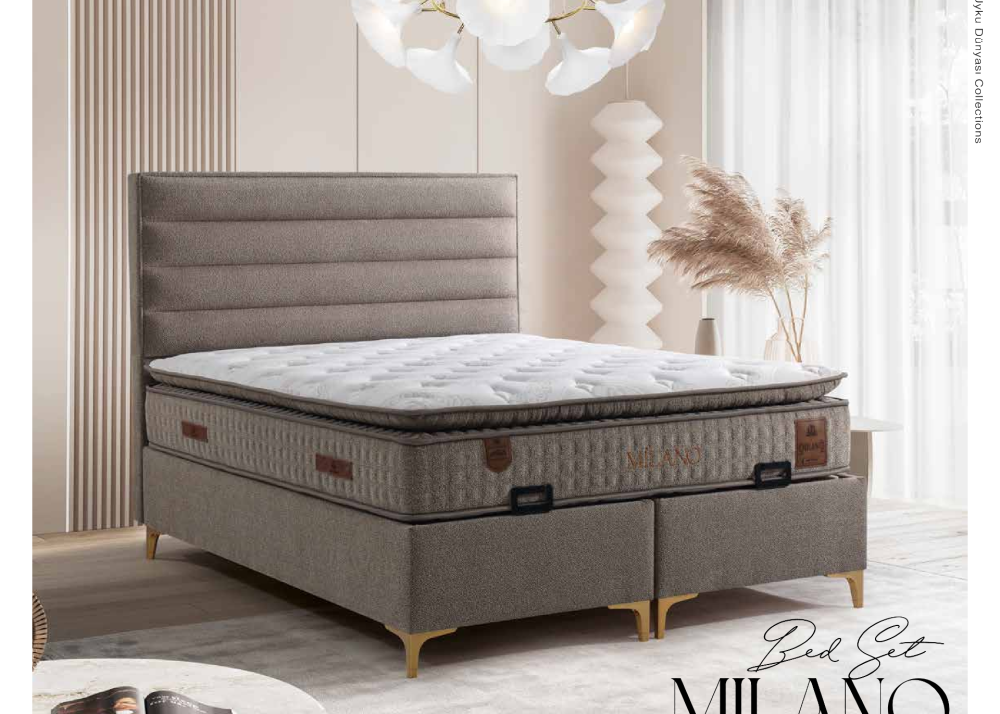 Тапицираното легло Milano Uyku Dunyasi се състои от елегантна капитонирана табла и основа с вградена повдигаща се подматрачна система с газови амортисьори, която осигурява просторно и удобно място за съхранение на спално бельо, възглавници, завивки и други вещи, изискващи практично и дискретно подреждане.