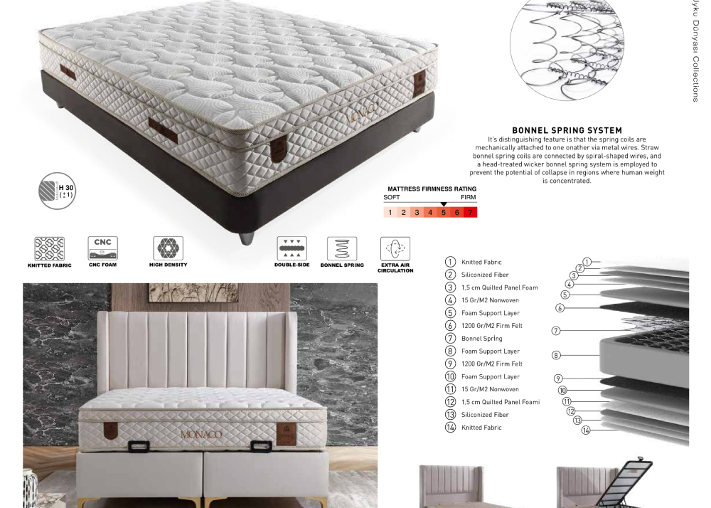 - Матрак Monaco е с ядро от Bonel Spring пружинна система обвита с борд от дунапрен с висока плътност и допълнителни омекотяващи слоеве от дунапрен и HR пяна.