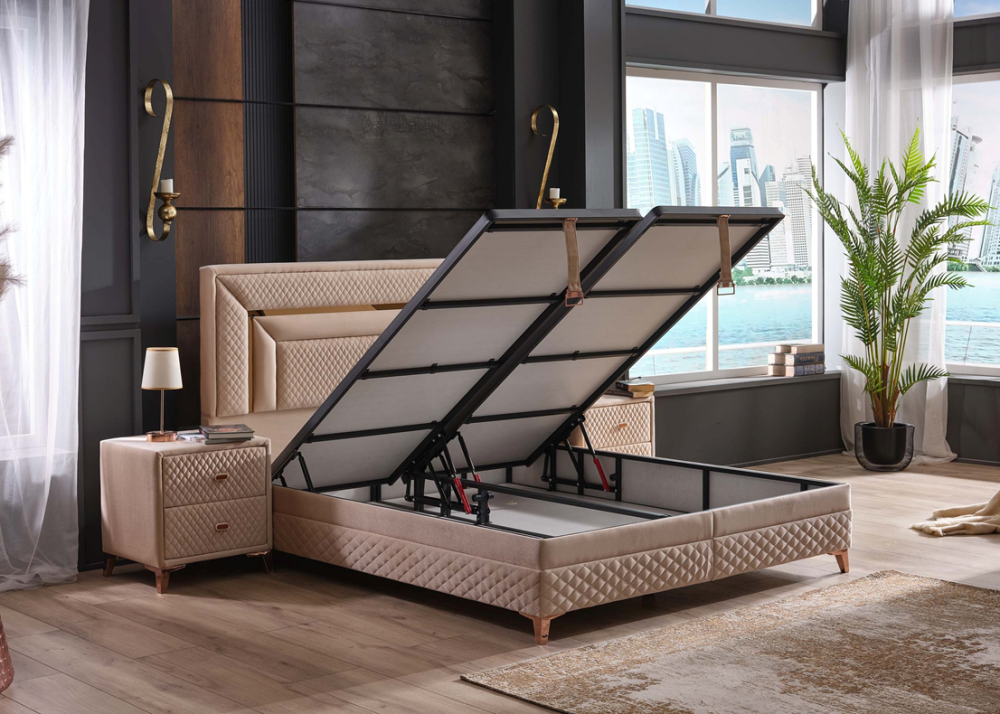- Базата е снабдена с дъно и нов модел повдигаща система от 1бр (за единичните размери) / 2бр метална подматрачна рамка с цял ламиниран ПДЧ панел. Рамката е оборудвана с 2бр / 4бр газови амортисьори /2х2/ по 750N, може да се повдига всяка основа по отделно или заедно, има спирачка на механизма, която може да се ползва когато механизма е отворен. На дъното и рамката са монтирани вентилационни капачки. Основата предоставя голямо празно подматрачно пространство, подходящо за съхранение на спални завивки и други вещи.