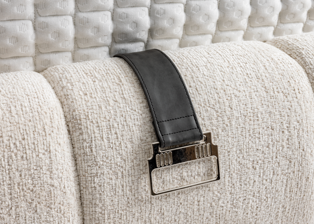 Тапицирано легло Premium в перлено бял цвят, разполага с луксозна капитонирана табла и основа с кожени дръжки, оборудвана с вградена повдигаща се подматрачна система. Предлага се с опция за покупка без матрак или в комплект с матрак Premium.