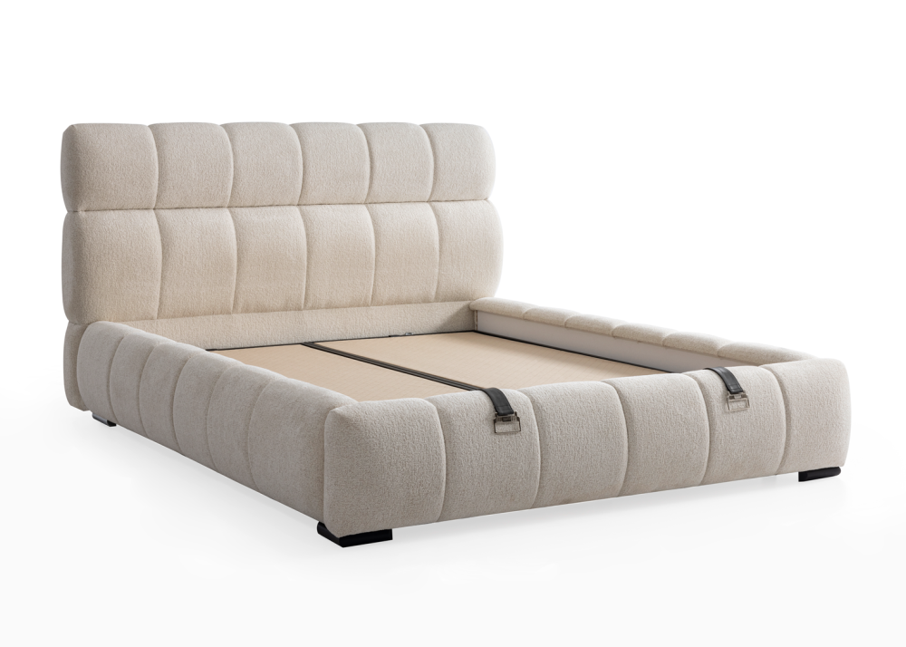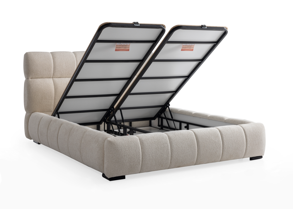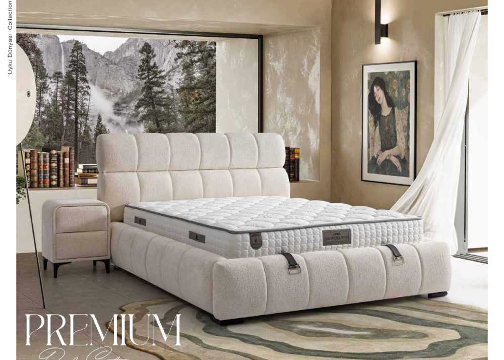 Тапицирано легло Premium се състои от луксозна капитонирана табла и тапицирана основа с кожени дръжки, улесняващи достъпа до вградена повдигаща се подматрачна система с газови амортисьори. Конструкцията предлага просторно и практично място за съхранение на завивки, спално бельо и други вещи, като съчетава функционалност, елегантен дизайн и висок клас комфорт – идеално решение за съвременната спалня.