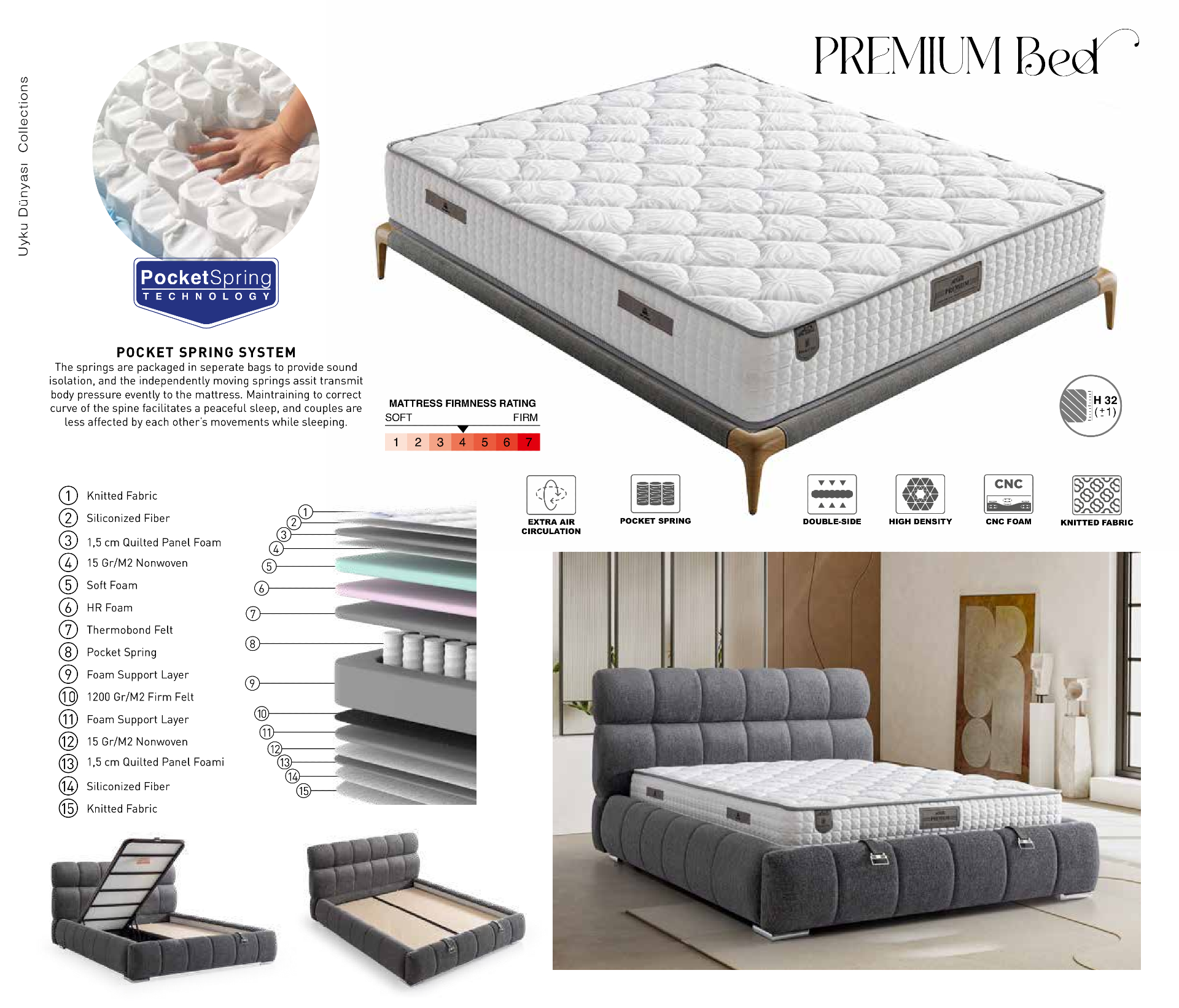 • Матрак Premium е с ядро от Pocket Spring пружинна система обвита с борд от дунапрен с висока плътност и допълнителни омекотяващи слоеве от дунапрен, слой от мека пяна и HR пяна.