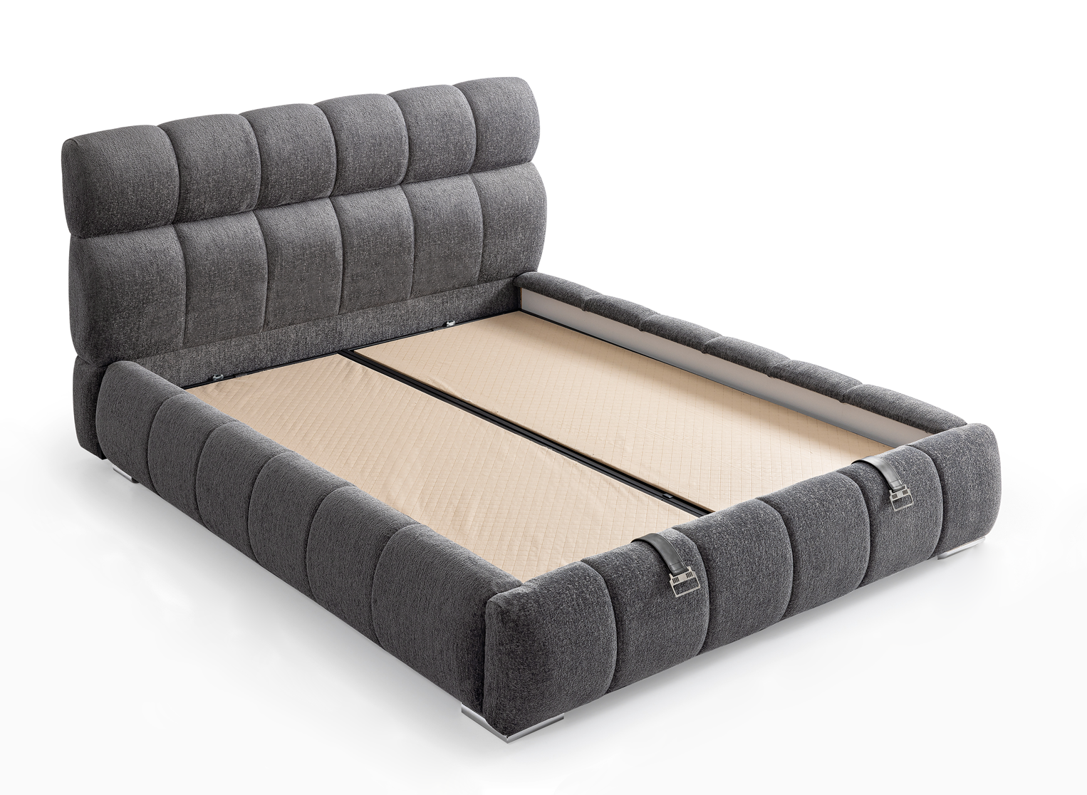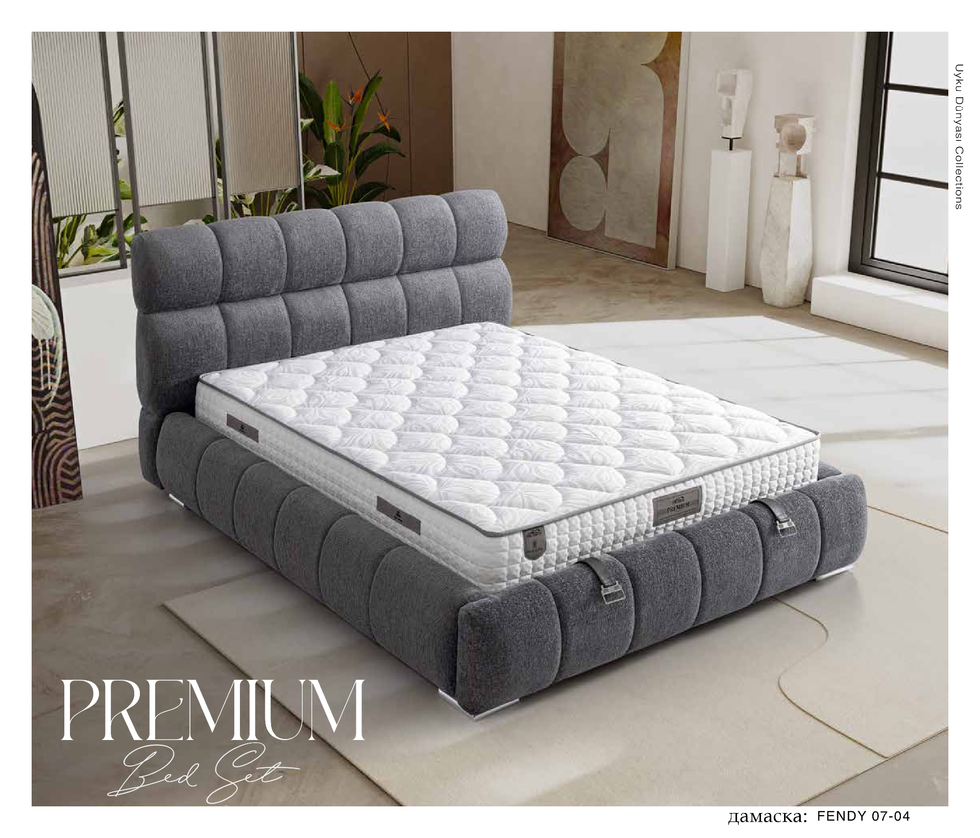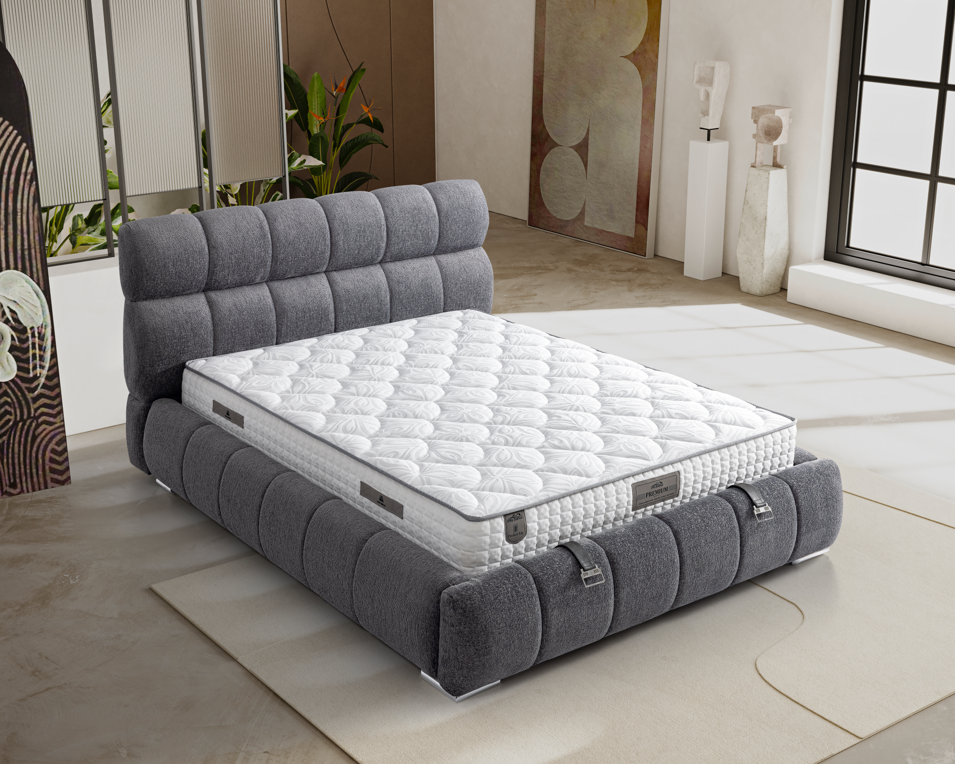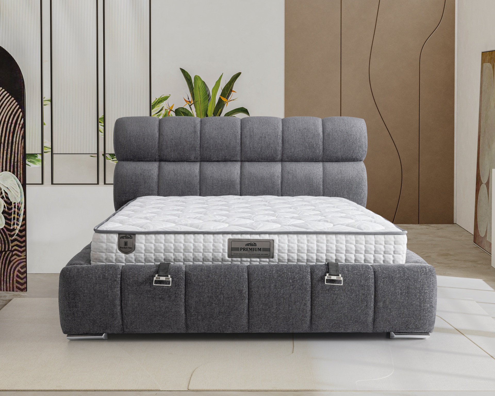 Тапицирано легло Premium в цвят Графитено сиво, разполага с луксозна капитонирана табла и основа с кожени дръжки, оборудвана с вградена повдигаща се подматрачна система. Предлага се с опция за покупка без матрак или в комплект с матрак Premium.