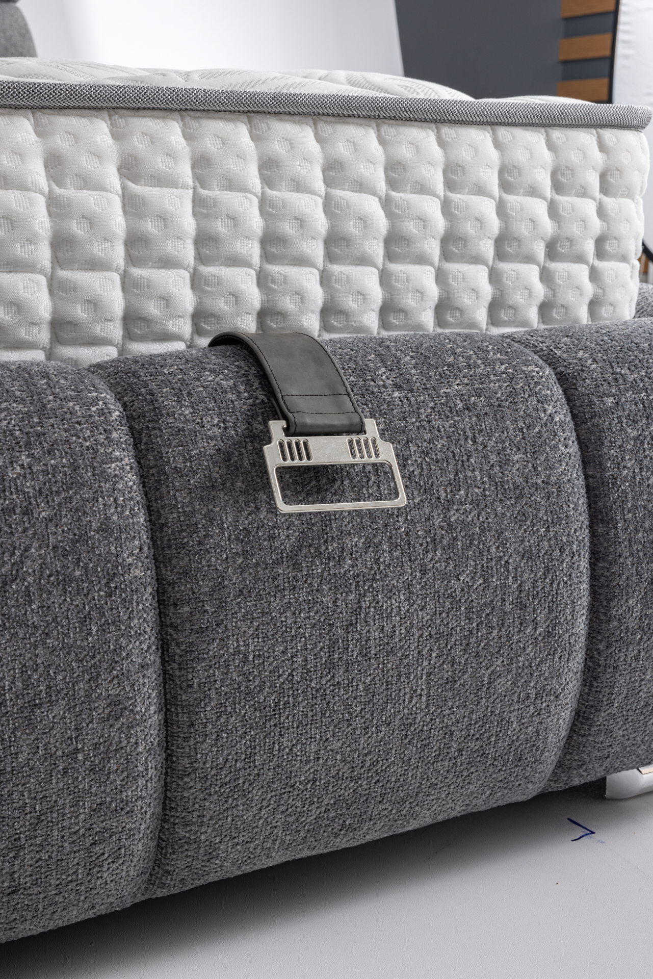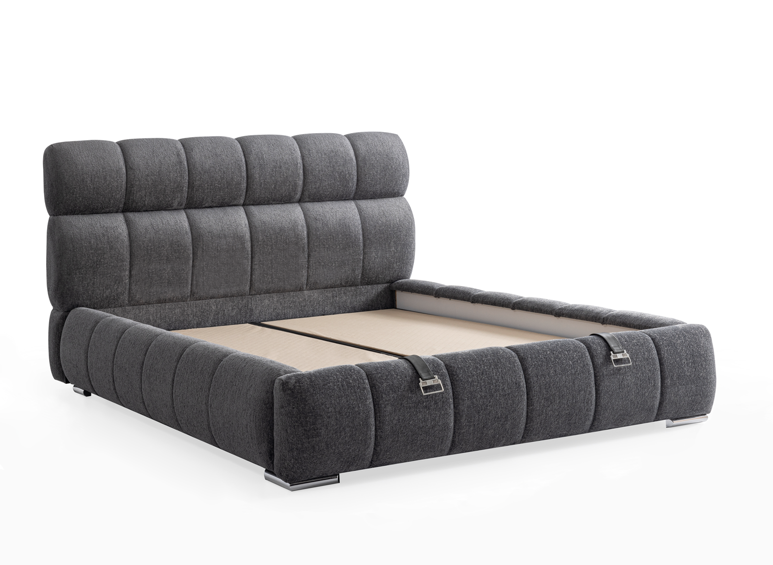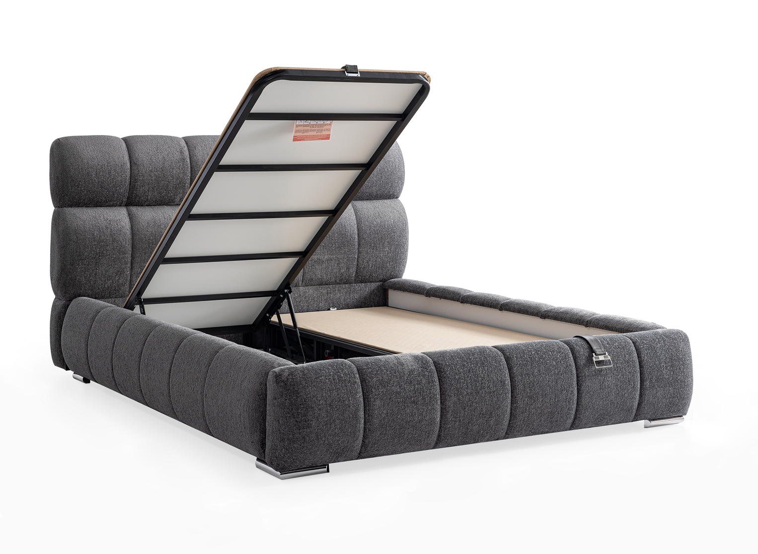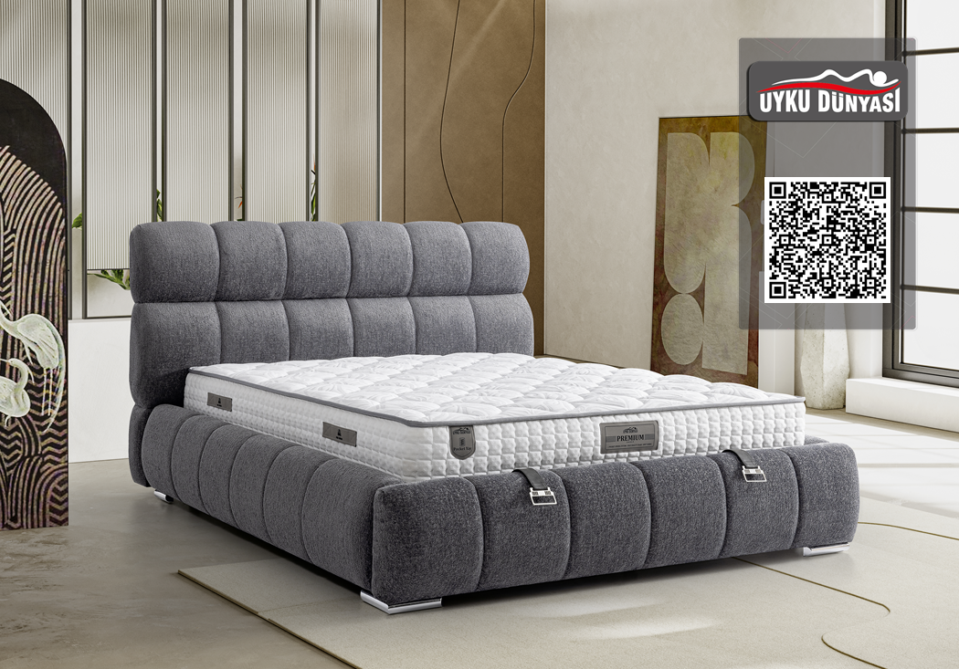 Тапицирано легло Premium в цвят Графитено сиво, разполага с луксозна капитонирана табла и основа с кожени дръжки, оборудвана с вградена повдигаща се подматрачна система. Предлага се с опция за покупка без матрак или в комплект с матрак Premium.