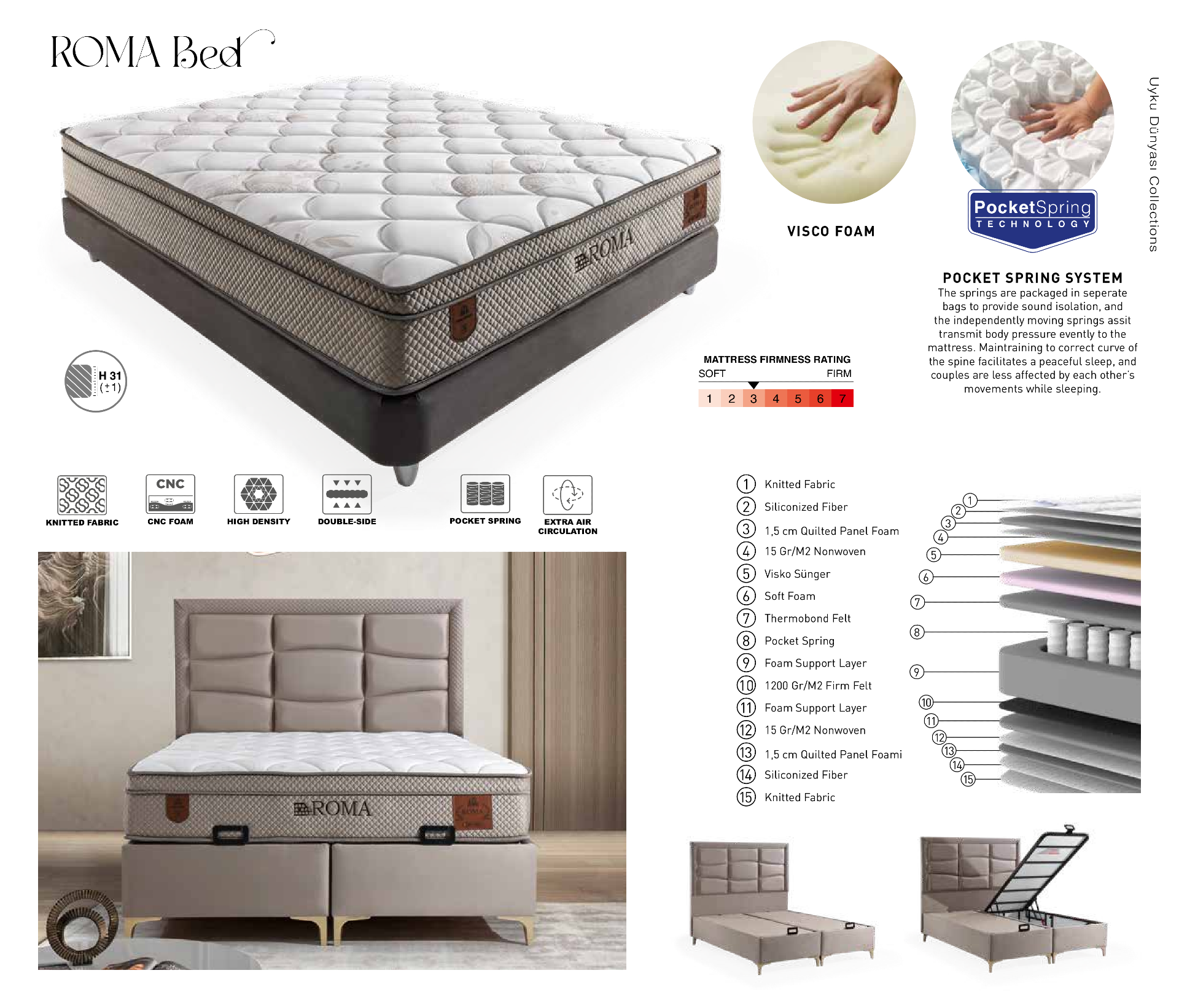 - Матрак Roma е с ядро от Pocket Spring пружинна система обвита с борд от дунапрен с висока плътност и допълнителни омекотяващи слоеве от memory пяна, Visko пяна и HR пяна.