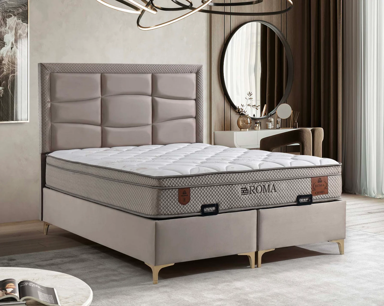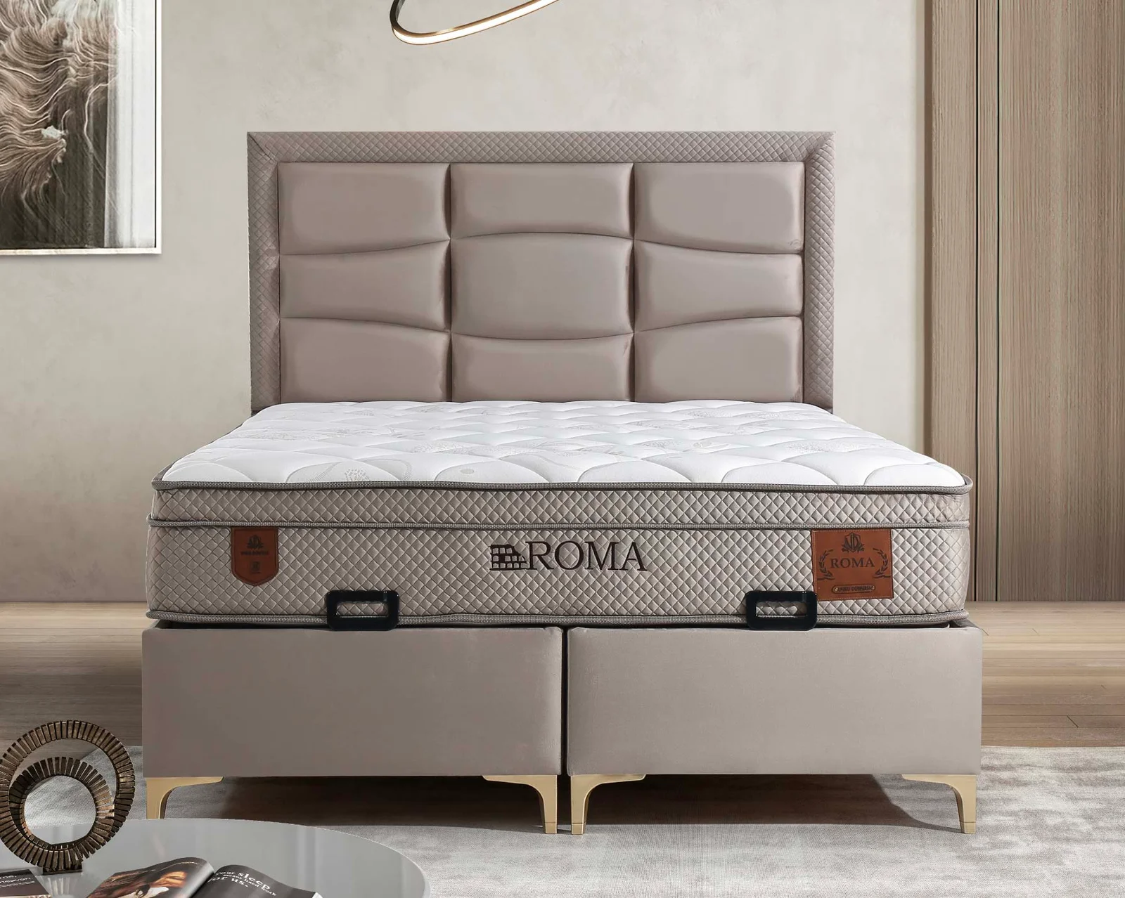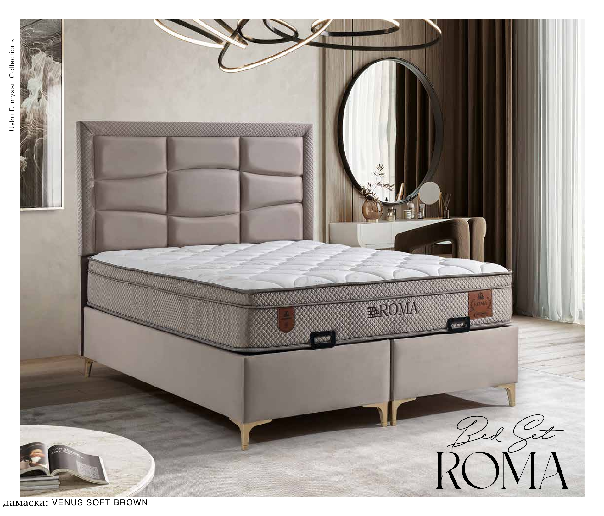 Легло Roma е проектиран с внимание към всеки детайл, съчетава функционалност и съвременна модерна визия. Неговата модерна капитонирана табла придава допълнителен комфорт и естетика, превръщайки го в елегантен акцент с изтънчен характер за всяка модерна спалня. Таблата и основата са тапицирани с качествена и устойчива дамаска VENUS SOFT BROWN в светлобежов цвят, която внася усещане за уют, комфорт и стил. Тапицираната основа е снабдена с вградена подматрачна система, оборудвана с повдигащ механизъм и газови амортисьори, които осигуряват лесен достъп до просторно вътрешно място за съхранение – идеално за завивки, възглавници, спално бельо и други вещи, изискващи практично и дискретно подреждане. Конструкцията на леглото гарантира здравина, удобство и дълготрайна експлоатация, съчетавайки функционалност, стил и надеждност в един завършен продукт, който се вписва перфектно във всяко съвременно интериорно пространство.