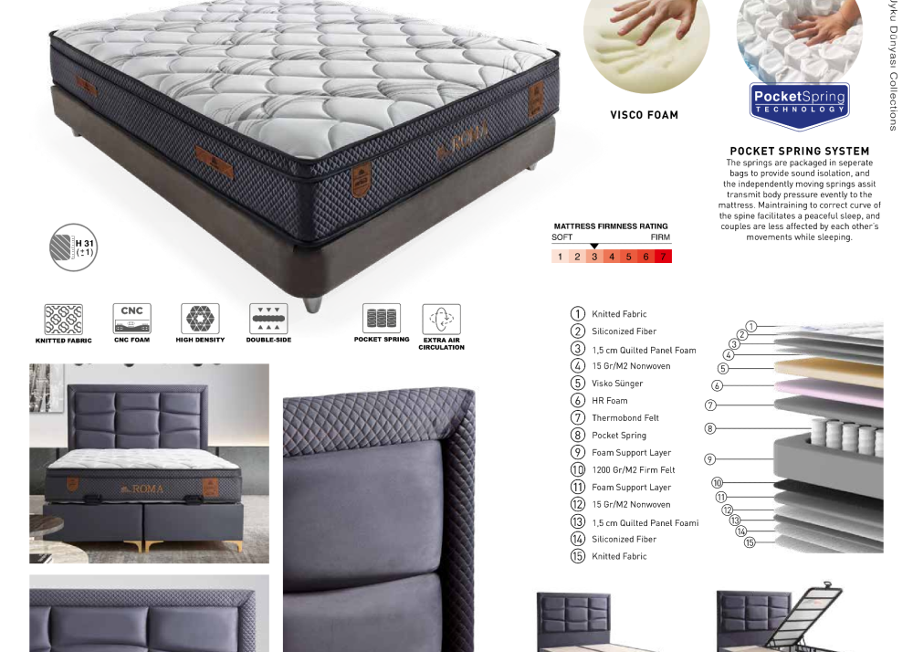 • Матрак Roma е с ядро от Pocket Spring пружинна система обвита с борд от дунапрен с висока плътност и допълнителни омекотяващи слоеве от memory пяна, Visko пяна и HR пяна.