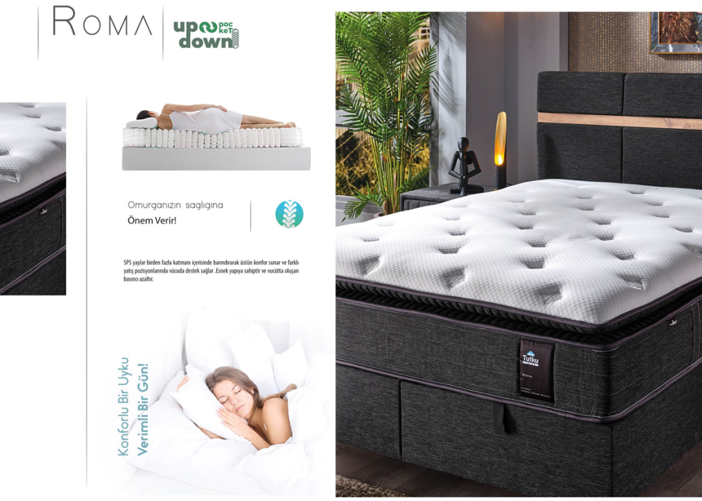 Комплект тапицирано легло Roma с матрак Roma Ortopedik, който е снабден с прошит топ матрак и дизайнерска дамаска която предотвратява изпотяването. Капитонираната табла е с красиви декоративни лайсни. Налична е в 5 размера.