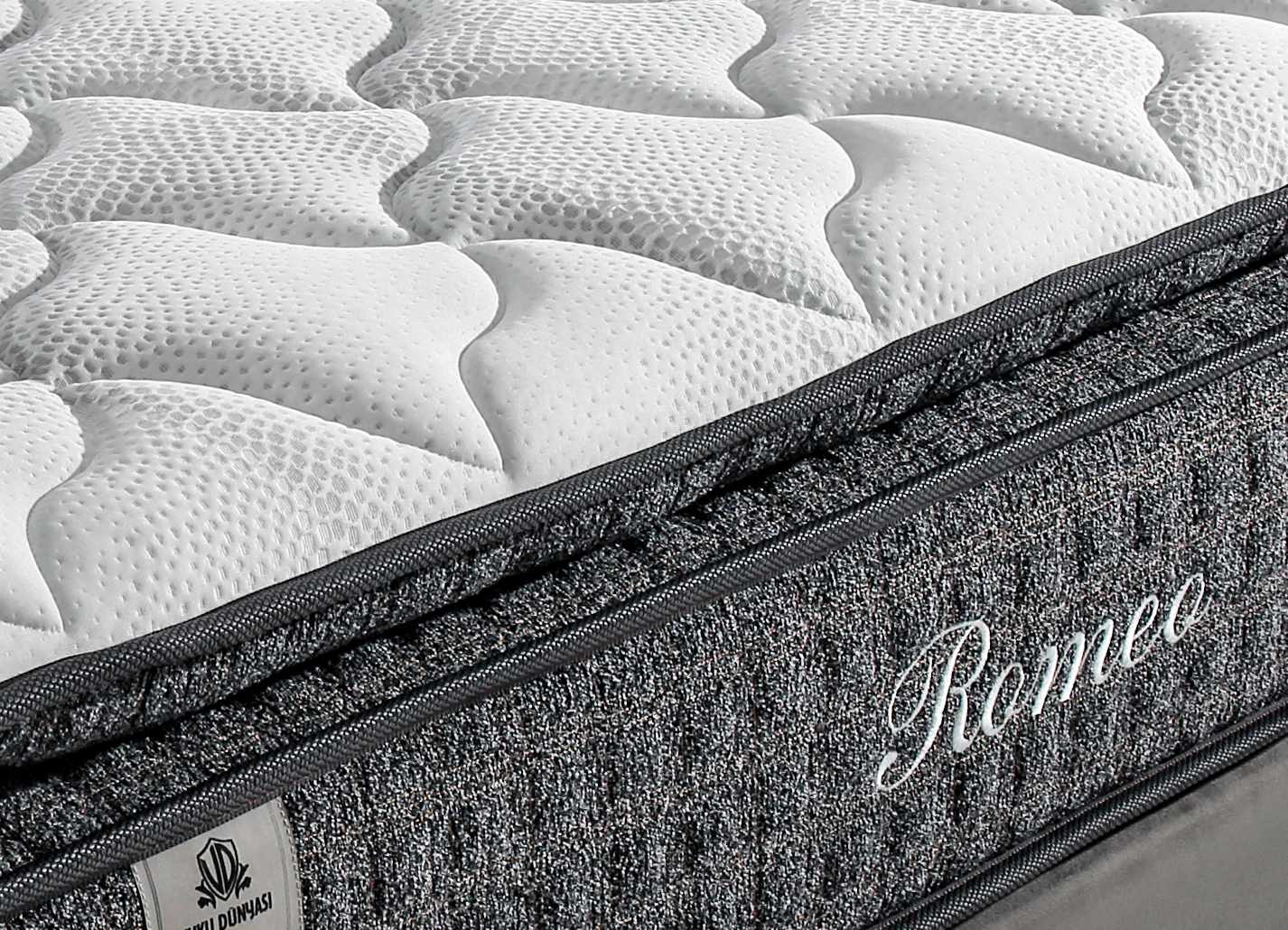 - Матракът Romeo е оборудван с прошит топ матрак от едната страна и ядро с Pocket Spring пружинна система, обвито с борд от дунапрен с висока плътност, който осигурява допълнителна устойчивост и стабилност. Вътрешната структура е допълнена с омекотяващи слоеве от дунапрен, мека пяна и HR пяна, гарантиращи дълготраен комфорт и ергономична опора по време на сън. Финалният щрих е дишащата дизайнерска дамаска Knitted Fabric, която съчетава елегантна визия и отлична проветривост.