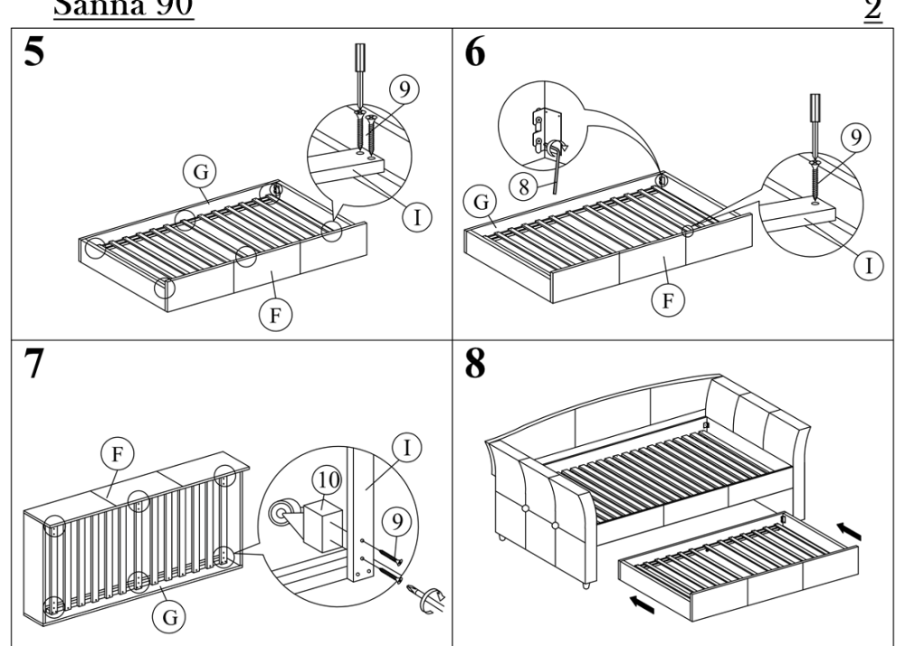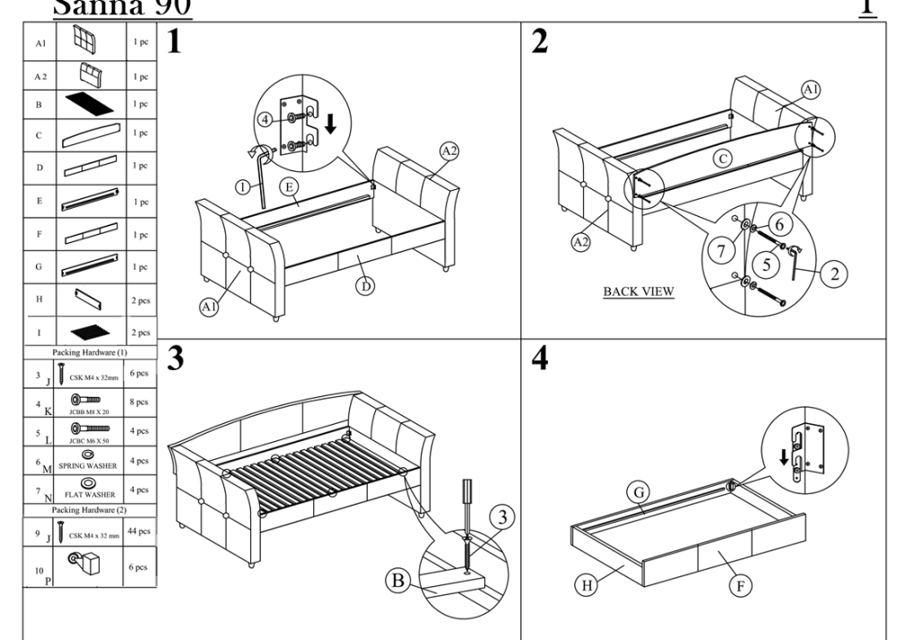 Тапицирано легло Sanna е функционално единично легло тип сандвич, разтегателно единично легло с възможност за поставяне на два матрака. Конструкцията е здрава и устойчива, изработва се от масивно каучуково дърво. Състои се от стабилна основа тип сандвич, две странични малки табли и една голяма табла. Легло Sanna е снабдена с основна дървена подматрачна рамка, разтегателен механизъм и втора дървена рамка в долната разтегателна част.