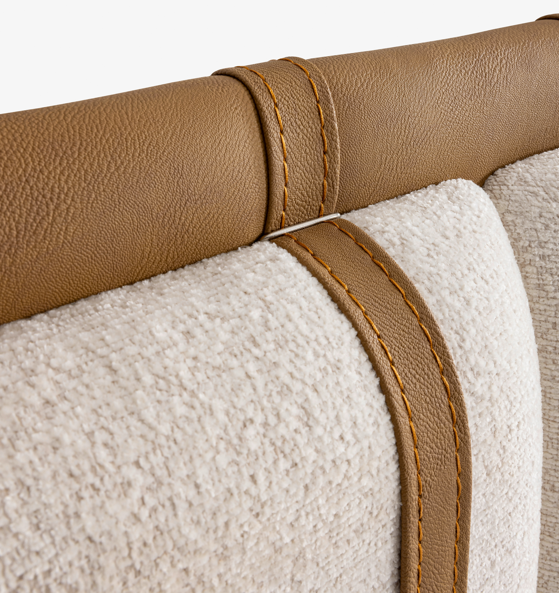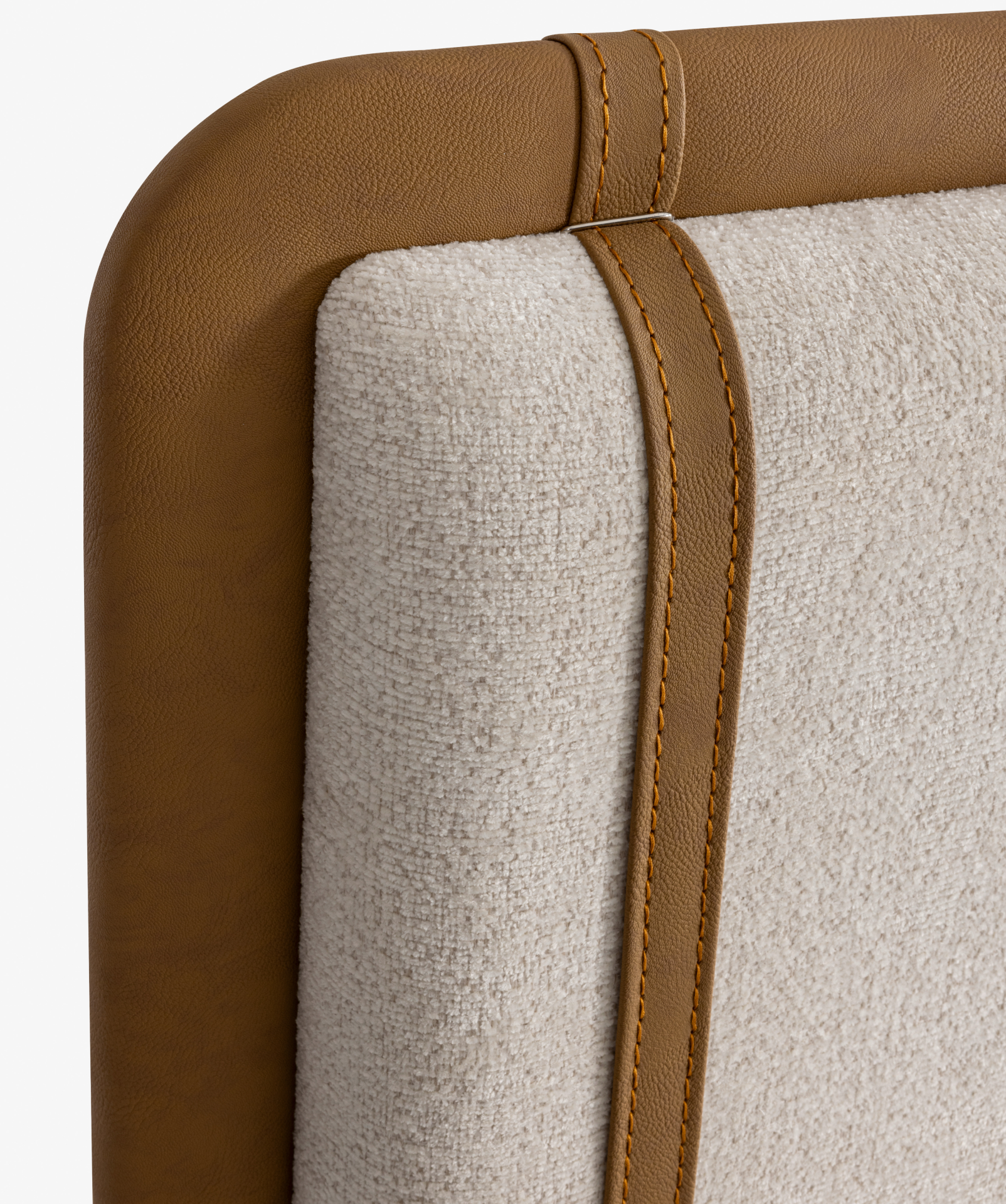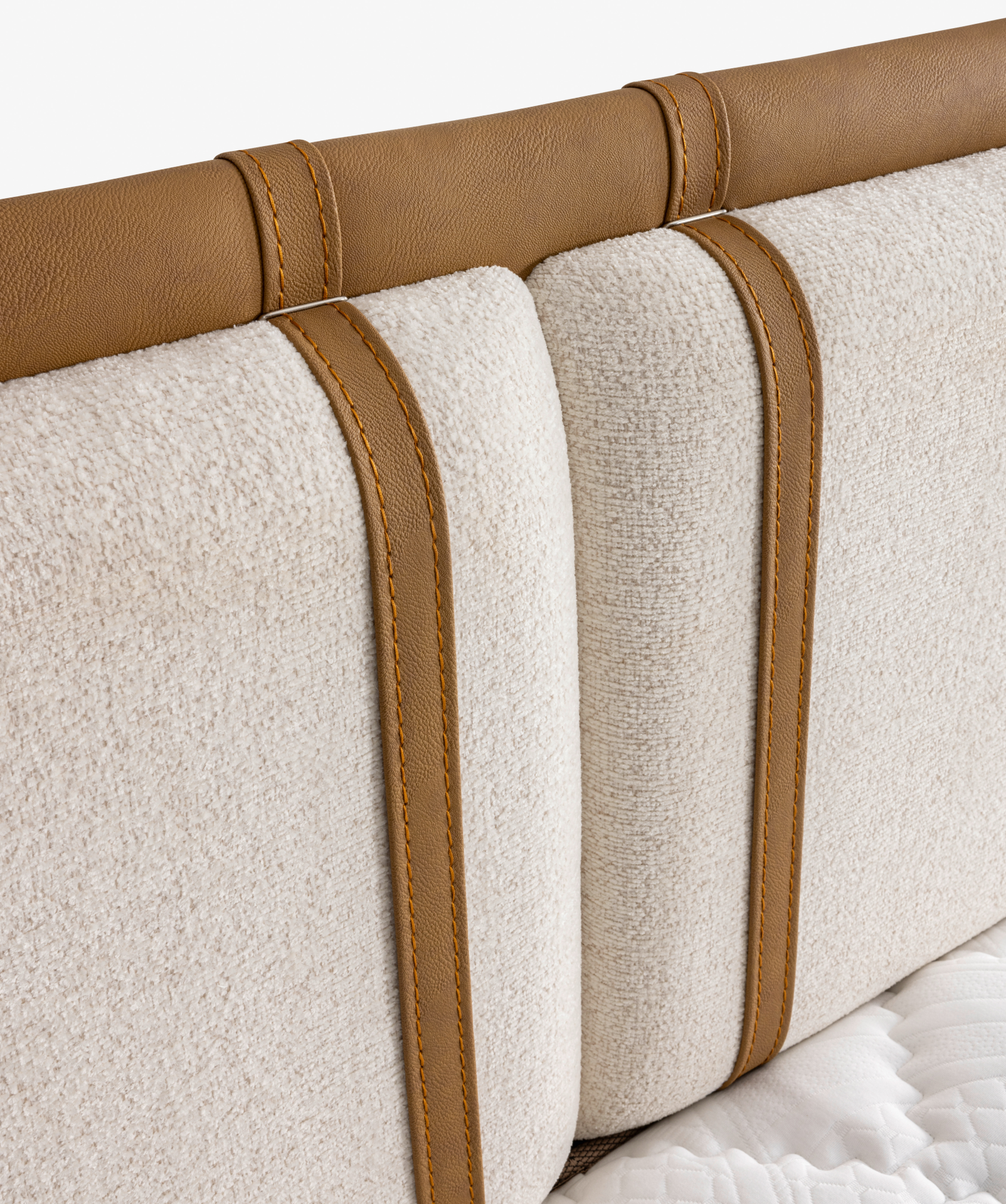 Тапицираното легло Sidelya Deluxe е изящен дизайнерски модел, който съчетава функционалност и стилна визия, проектиран с изключително внимание към всеки детайл. Конструкцията включва капитонирана табла и тапицирана основа, изпълнени с висококачествена и устойчива дамаска FENDY 07-02 в елегантен цвят перлено бяло, която създава усещане за лукс, комфорт и съвременен стил. Таблата е допълнително декорирана с елегантни кожени акценти, които подчертават изтънчения характер на модела и го превръщат в централна част от интериора на всяка модерна спалня.