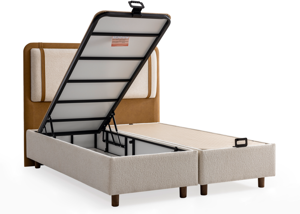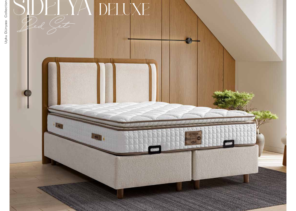 Тапицираното легло Sidelya Deluxe се състои от елегантна капитонирана табла, декорирана с тапицирани кожени акценти, които добавят усещане за стил и лукс във всяка съвременна спалня. Основата е снабдена с вградена повдигаща се подматрачна система с газови амортисьори, която осигурява просторно и удобно място за съхранение на спално бельо, възглавници, завивки и други вещи, изискващи практично и дискретно подреждане.