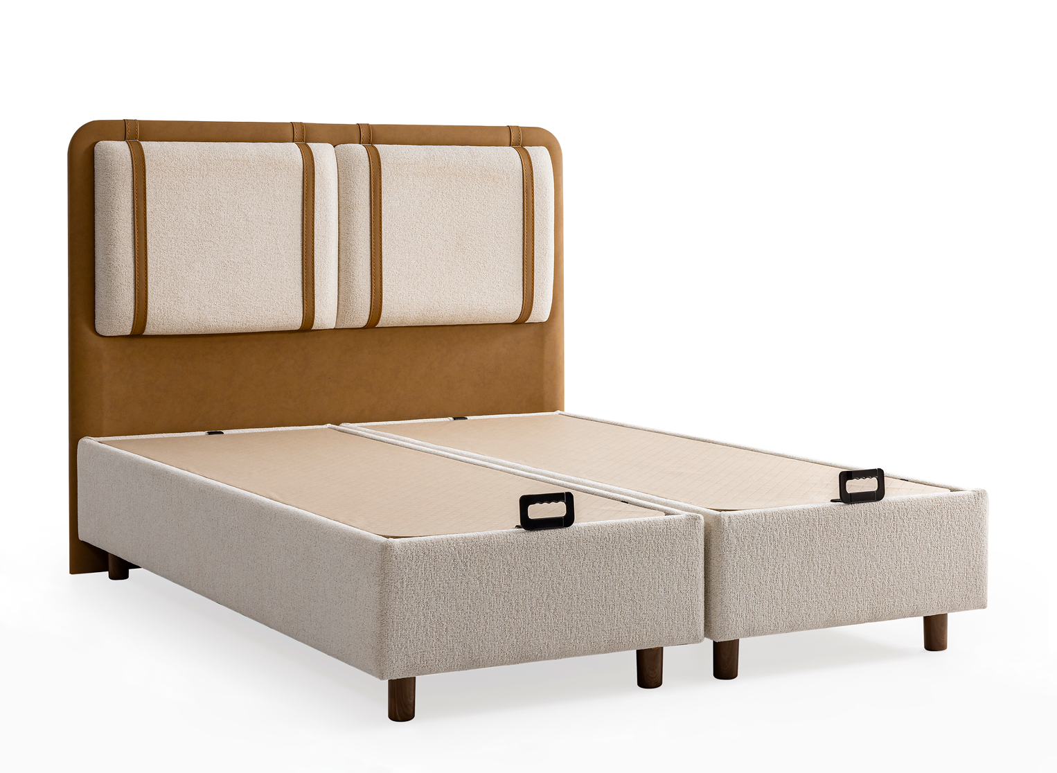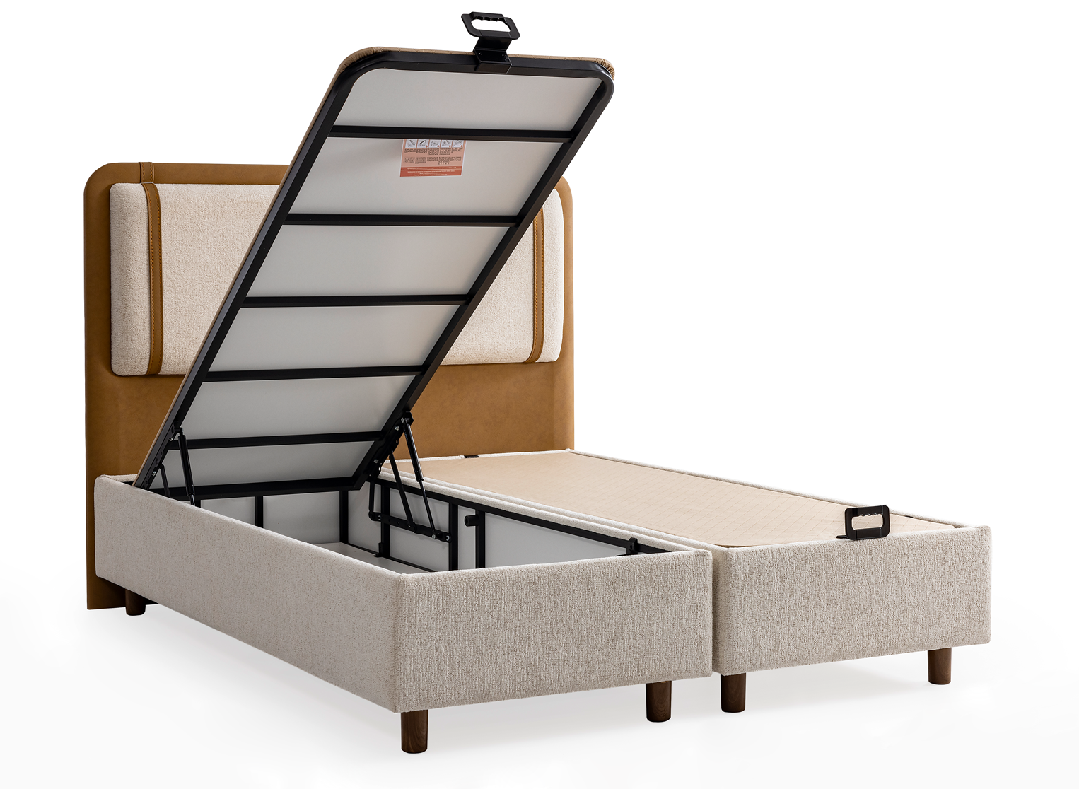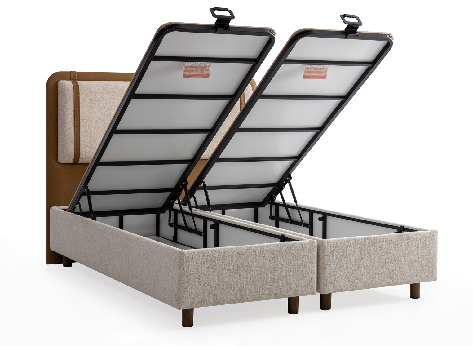 Тапицираната основа е снабдена с вградена подматрачна система с повдигащ механизъм и газови амортисьори, които осигуряват лесен и удобен достъп до просторната вътрешна зона за съхранение – идеална за спално бельо, завивки, възглавници и други вещи, нуждаещи се от дискретно и организирано подреждане. Конструкцията гарантира стабилност, дълготрайна експлоатация и ежедневен комфорт, като съчетава функционалност, надеждност и естетика в един луксозен завършен продукт, който ще обогати всяко елегантно интериорно пространство.