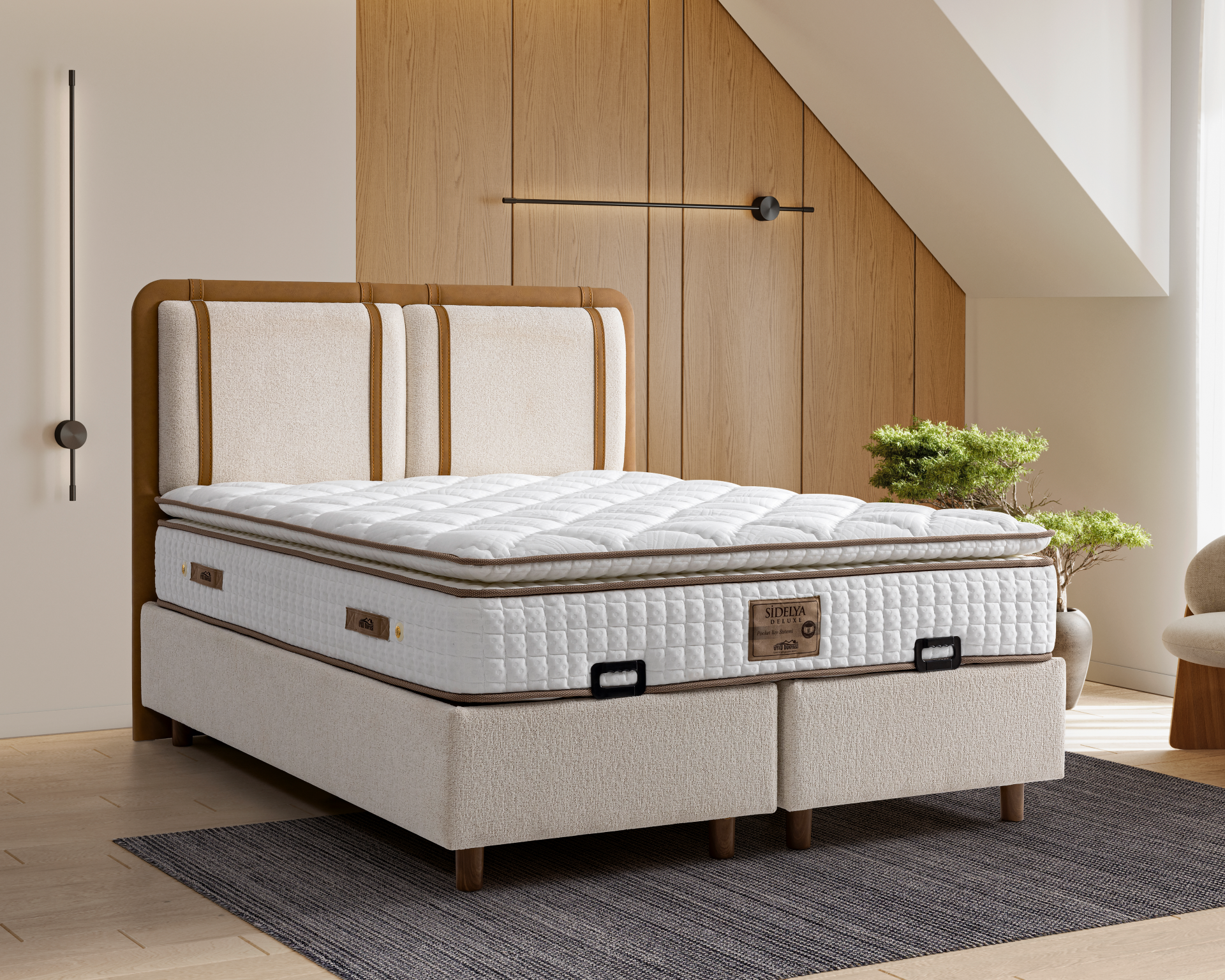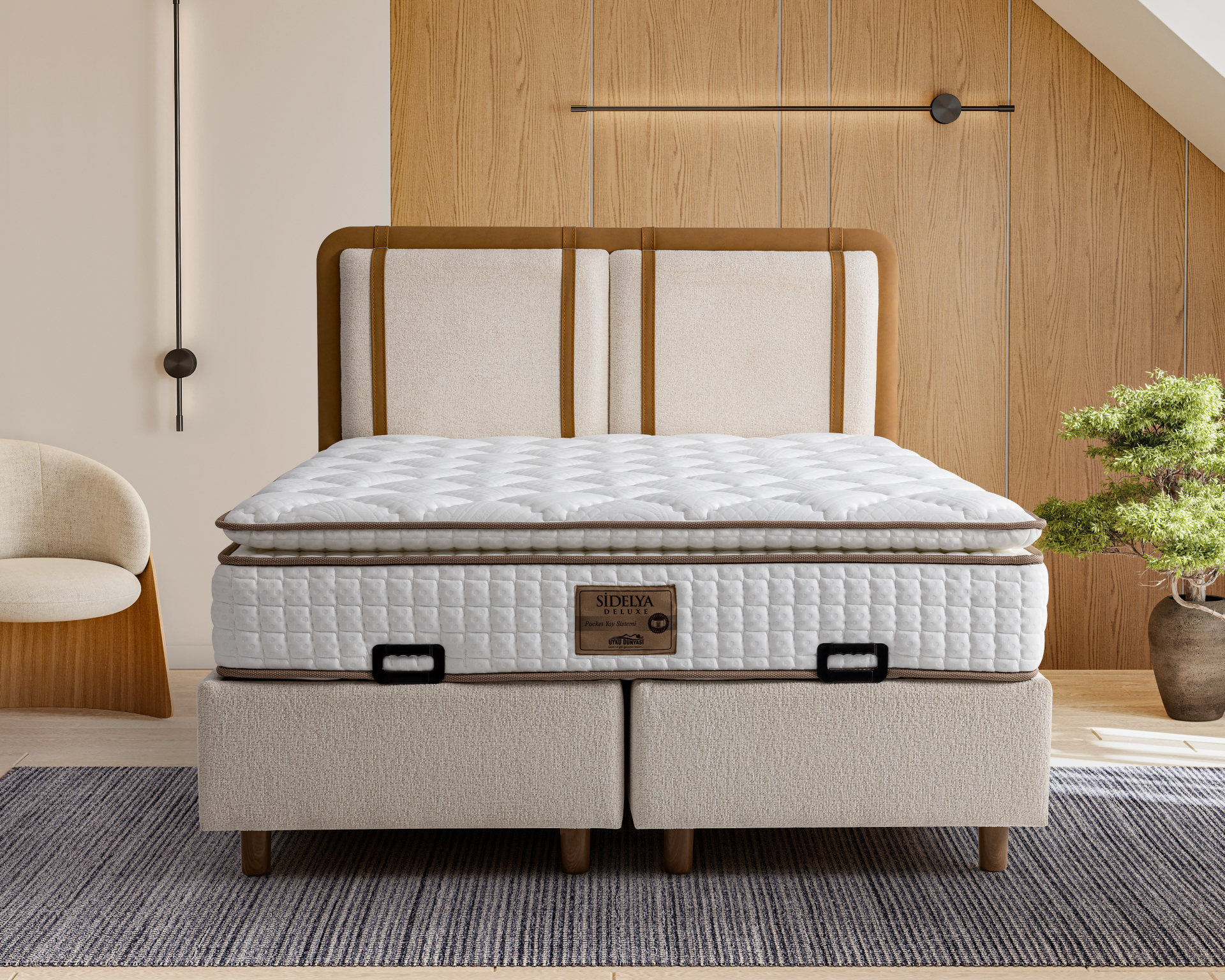 - Матракът Sidelya Deluxe е оборудван с прошит топ матрак от едната страна и ядро с Pocket Spring пружинна система, обвито с борд от дунапрен с висока плътност, който осигурява допълнителна устойчивост и стабилност. Вътрешната структура е допълнена с омекотяващи слоеве от дунапрен, мека пяна и HR пяна, гарантиращи дълготраен комфорт и ергономична опора по време на сън. Финалният щрих е дишащата дизайнерска дамаска Knitted Fabric, която съчетава елегантна визия и отлична проветривост.