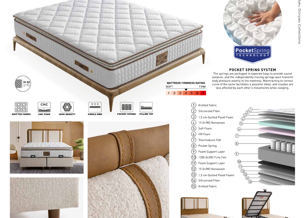 • Матрак Sidelya Deluxe е с ядро от Pocket Spring пружинна система обвита с борд от дунапрен с висока плътност и допълнителни омекотяващи слоеве от дунапрен, мека пяна и HR пяна.
