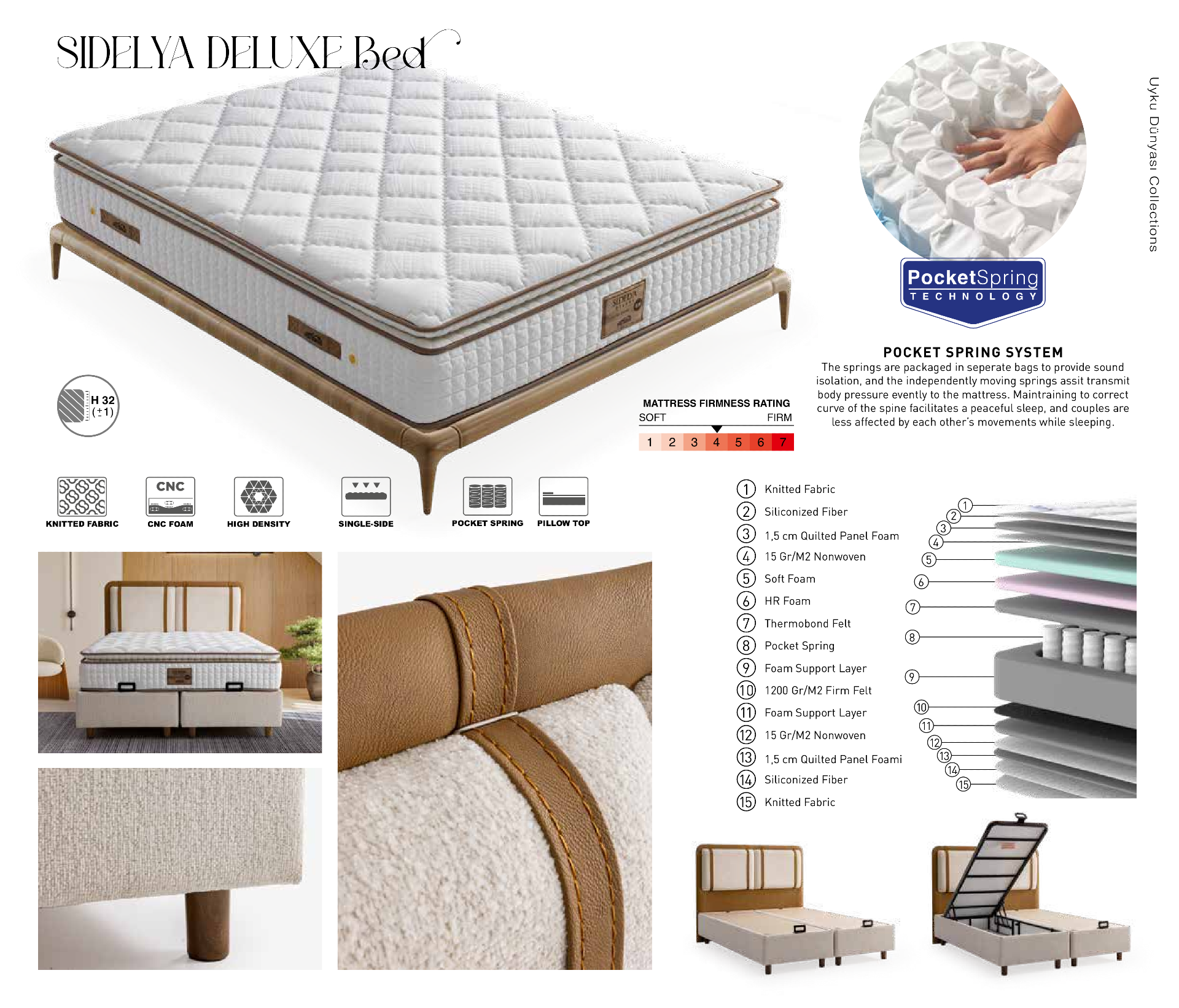 - Матрак Sidelya Deluxe е с ядро от Pocket Spring пружинна система обвита с борд от дунапрен с висока плътност и допълнителни омекотяващи слоеве от дунапрен, мека пяна и HR пяна.